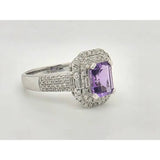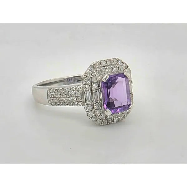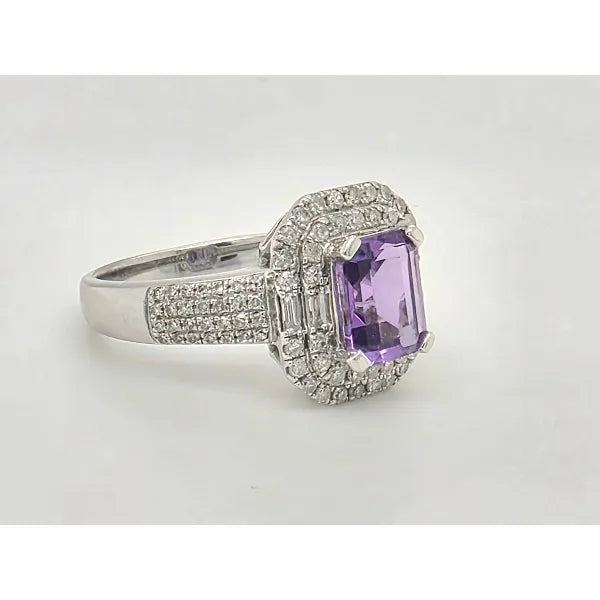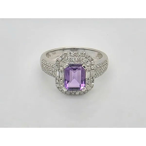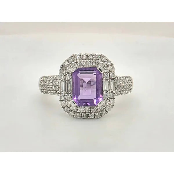 This refined 14kt white gold ring features a captivating 1.5-carat amethyst as its focal point, surrounded by approximately 0.5 carats of natural diamonds. The deep violet amethyst is expertly paired with brilliant diamond accents that amplify its natural radiance and create striking contrast.