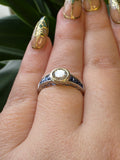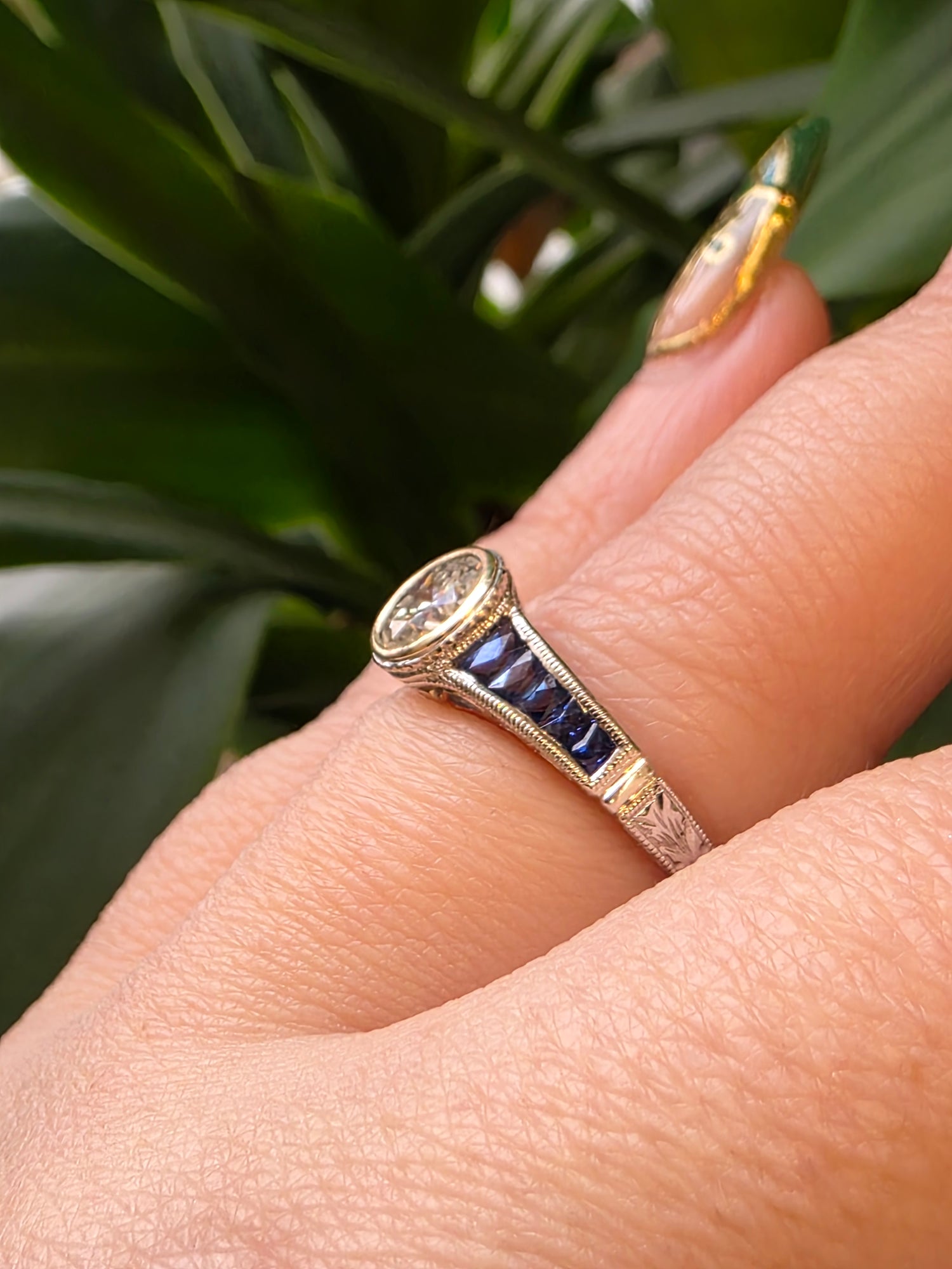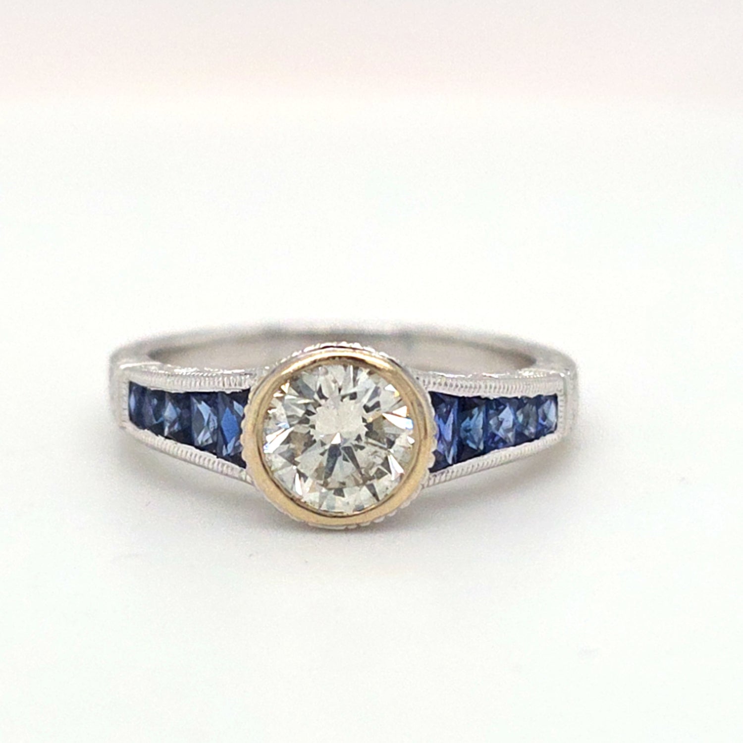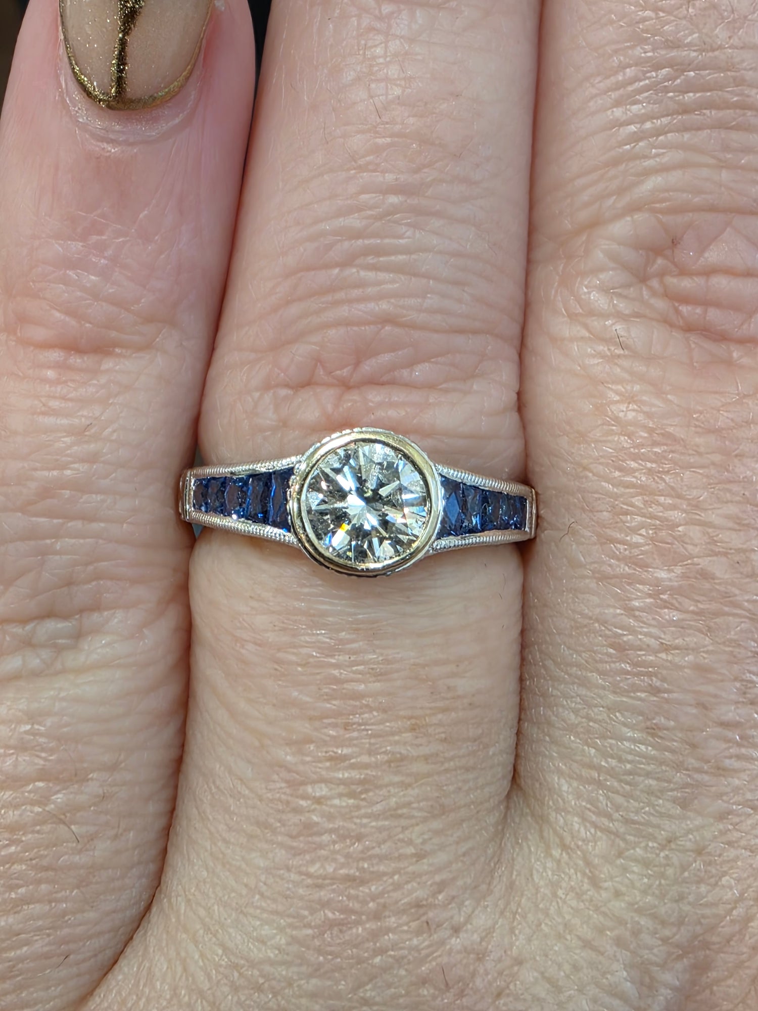 Refined elegance with a vibrant edge, this ring showcases a stunning 1.00ct (G, VS1) round center diamond complemented by .50ctw of rich sapphire accents. Crafted in luxurious 18kt white gold, it offers exceptional brilliance balanced by deep, captivating color. Currently a size 6.75, it’s a timeless piece with distinctive character.