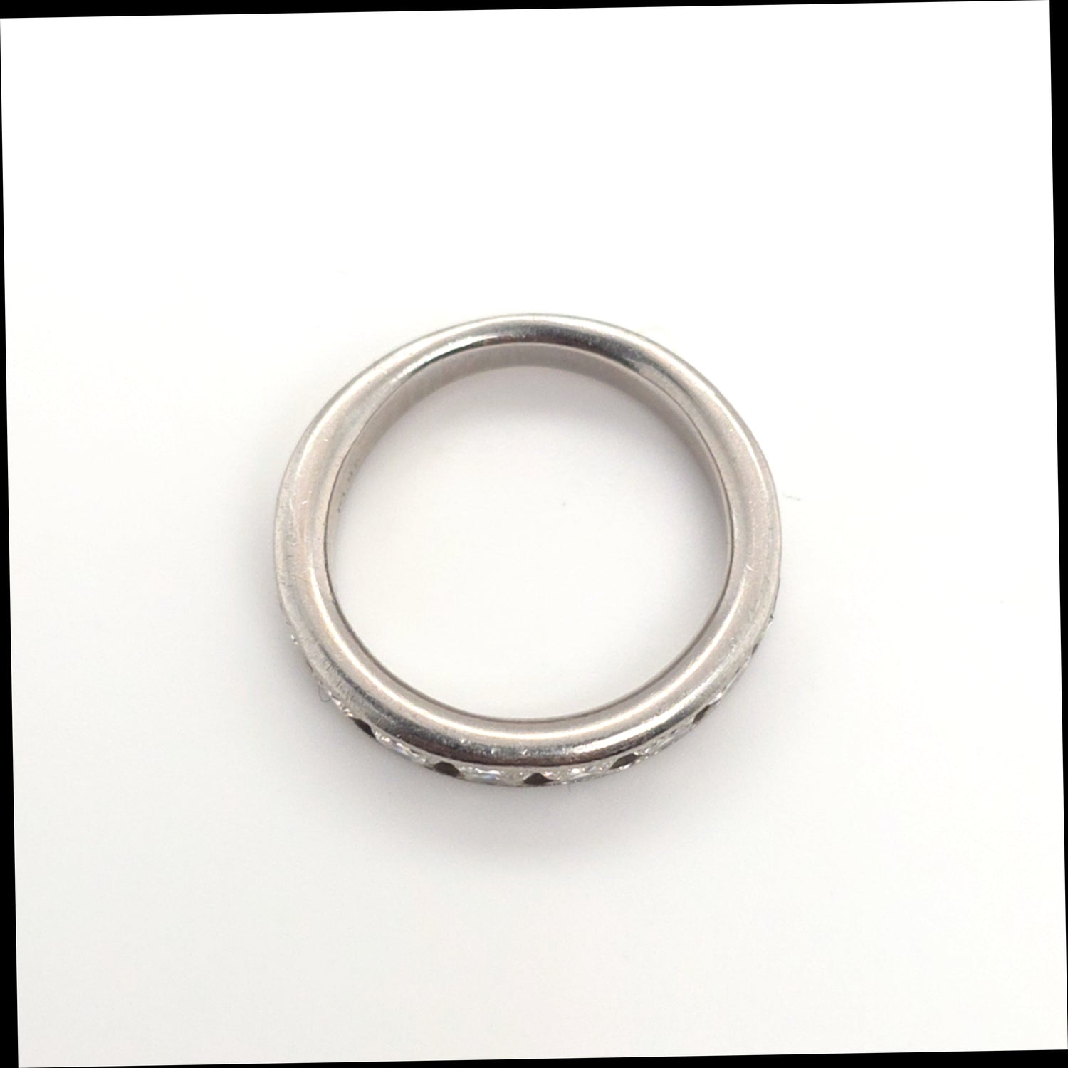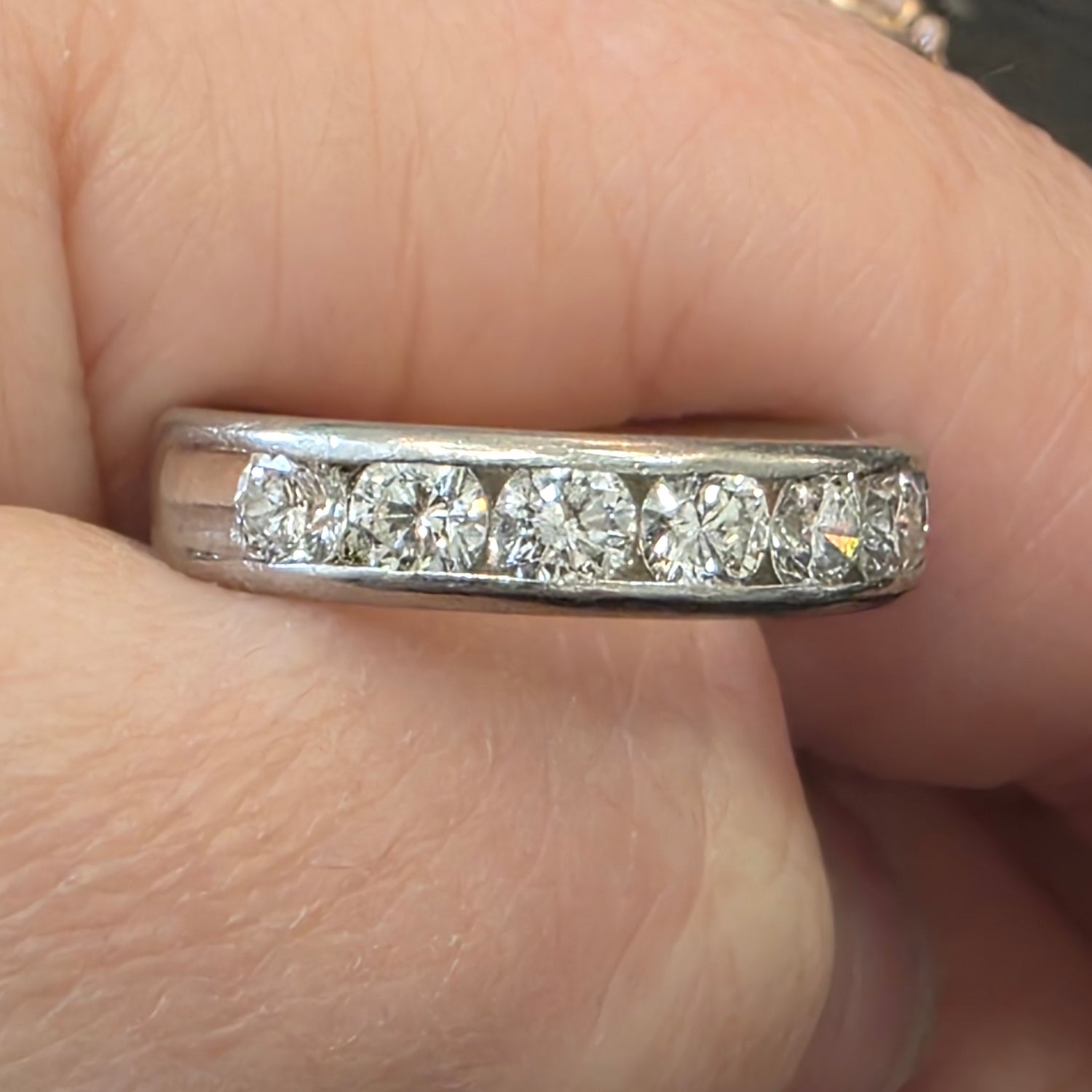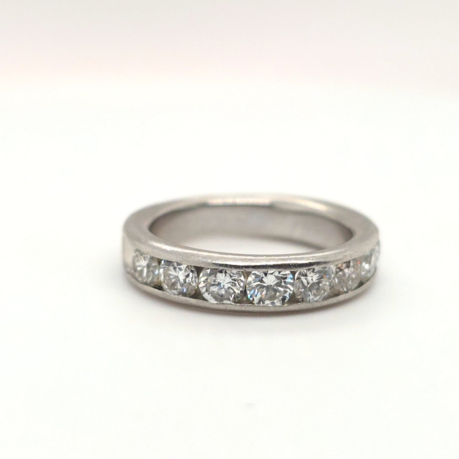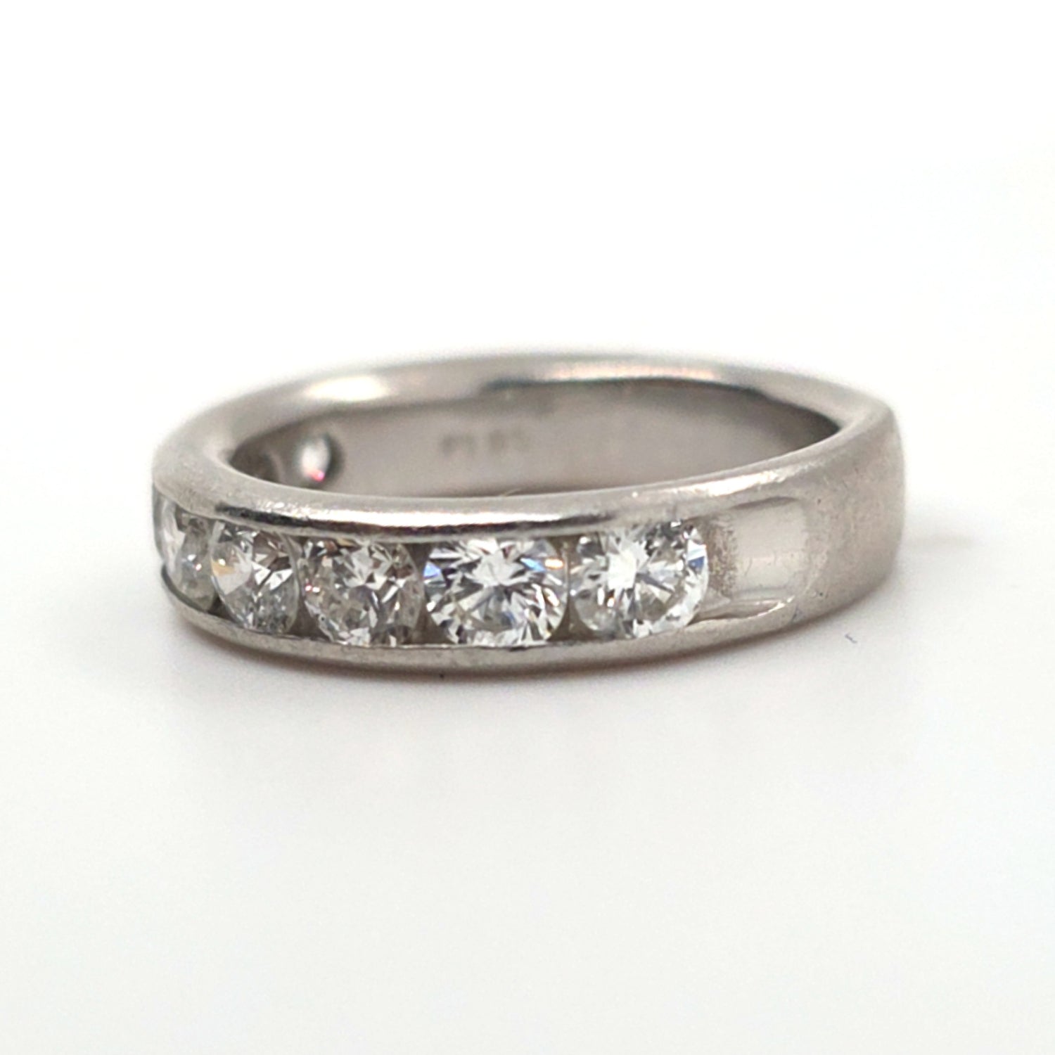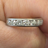 Classic and elegant, this band features approximately 1.00ctw of natural diamonds with SI clarity and G–H color, set in luxurious platinum. The timeless design offers brilliant sparkle and everyday wearability. Ring size is 6 and perfect as a wedding band or stackable accent ring.