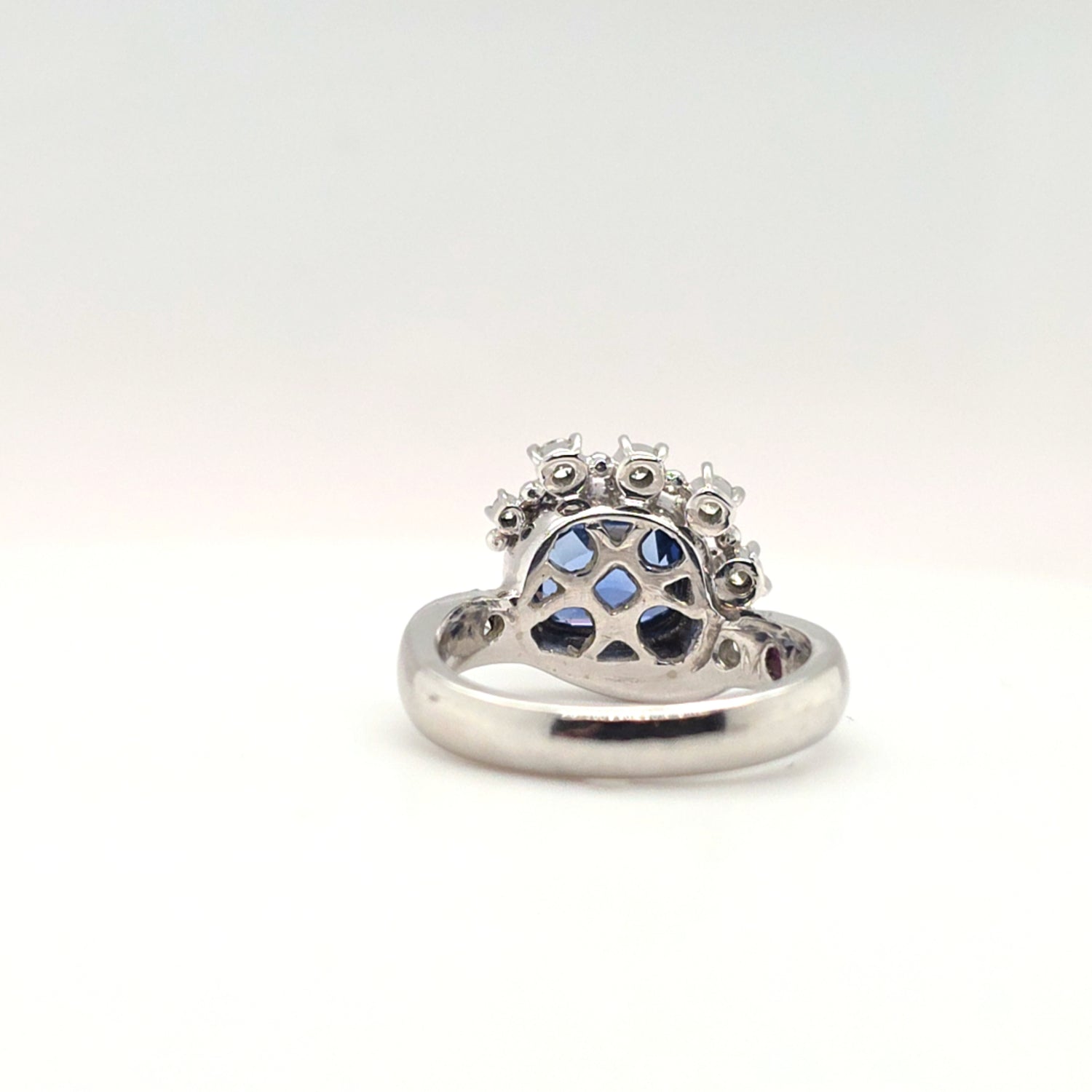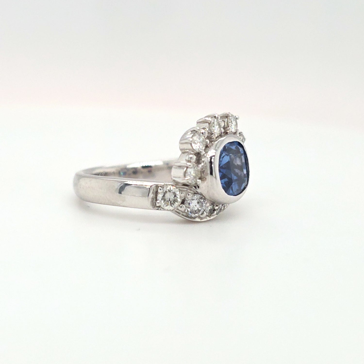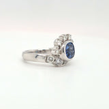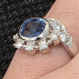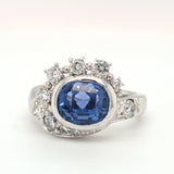 Elegant and timeless, this ring features a 2.54ct natural blue sapphire framed by .63ctw of sparkling natural diamonds, all set in luxurious platinum. The classic halo-style design highlights the rich color and brilliance of the stones, making it perfect as an engagement ring or statement piece. Ring size is 5.25 and ready to wear.