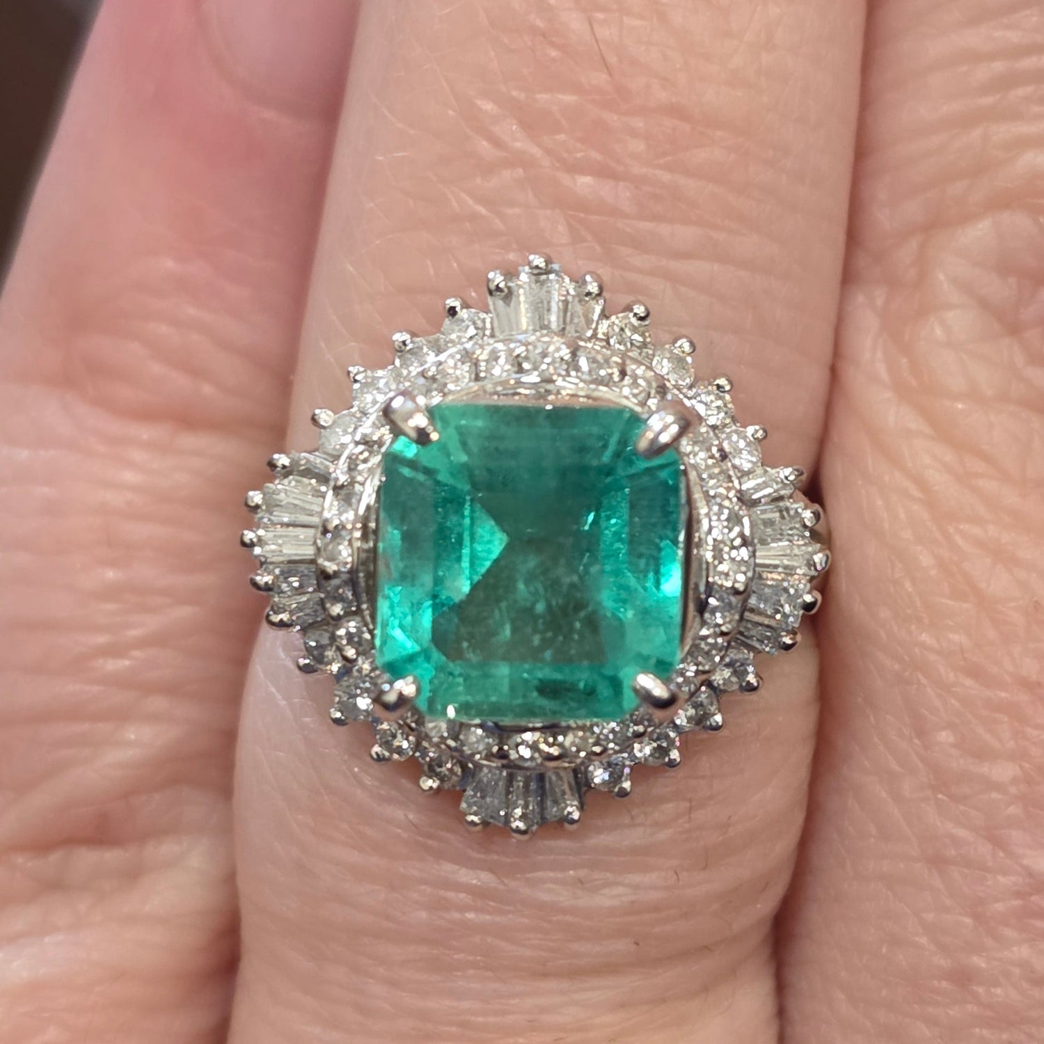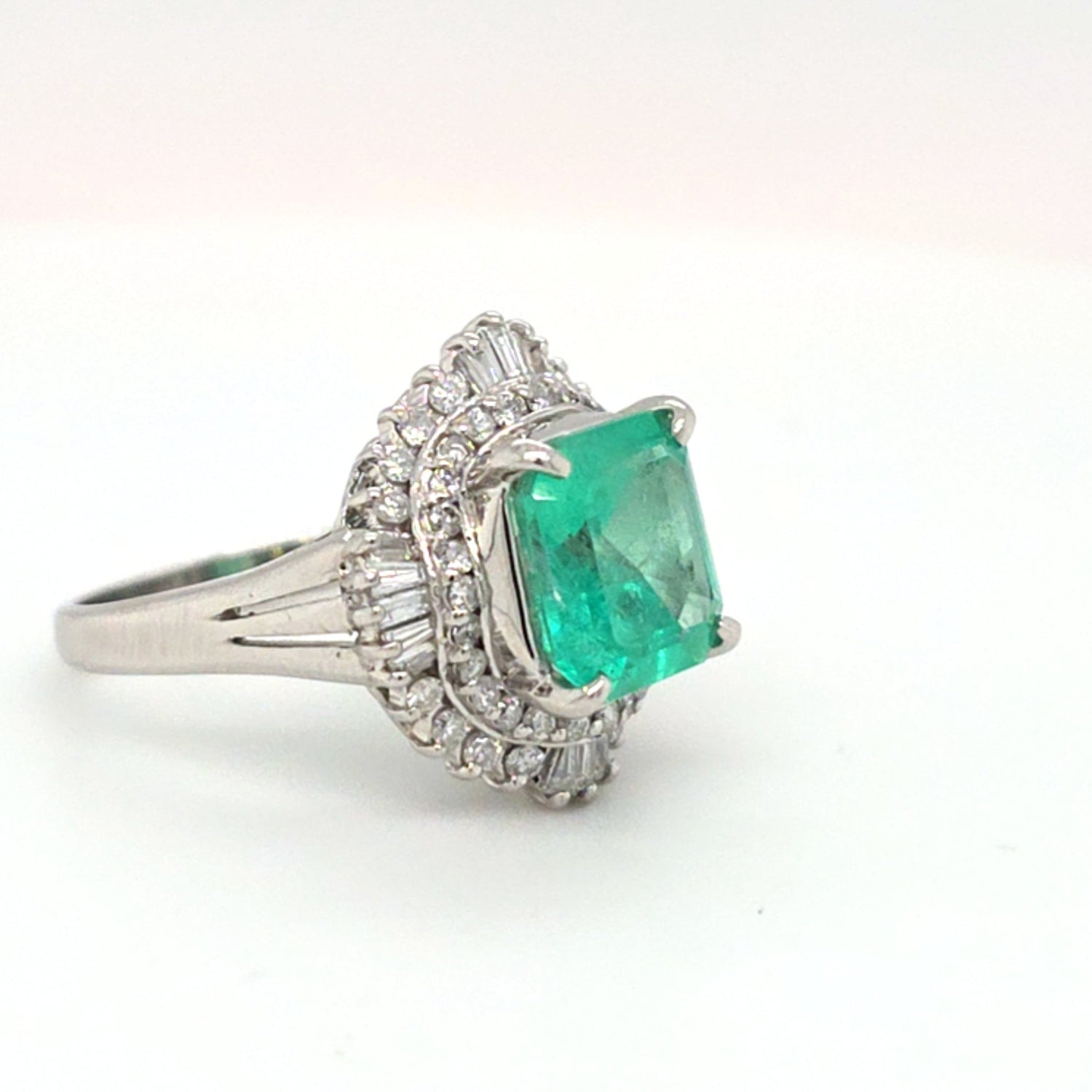 This platinum ring features a vivid 2.86ct natural Colombian emerald accented by 0.61ctw of natural diamonds for exceptional sparkle sized at 6.5.