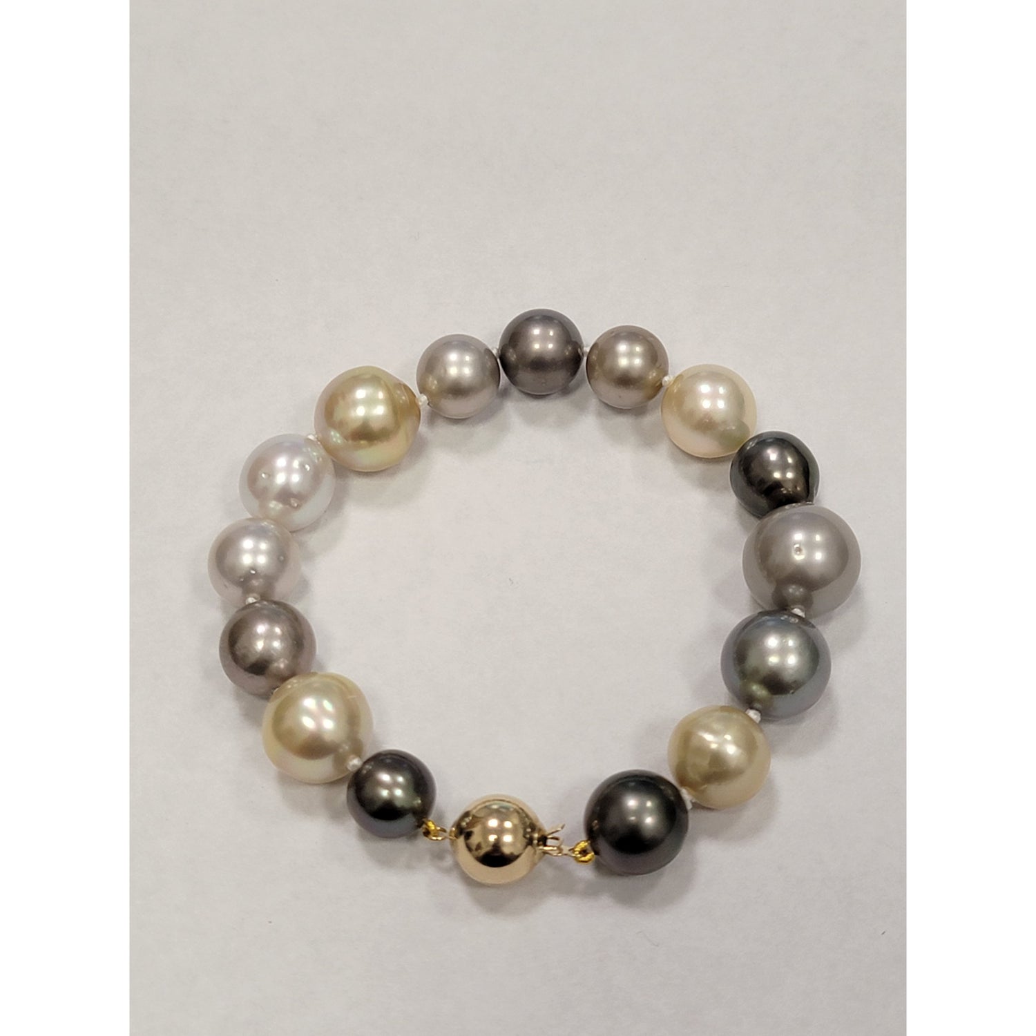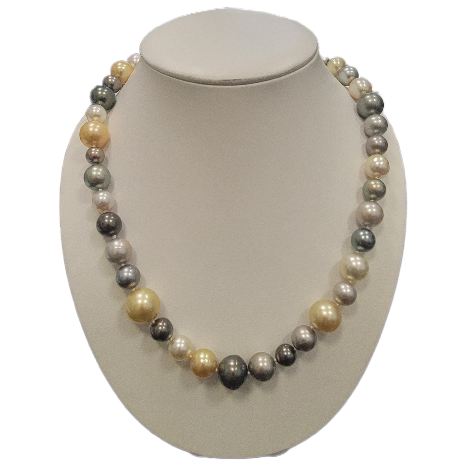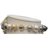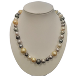 This is a multicolor pearl necklace and bracelet featuring white, silver-gray, and golden pearls arranged in a graduated pattern. The mix of tones and sizes gives it a sophisticated, elegant look.
