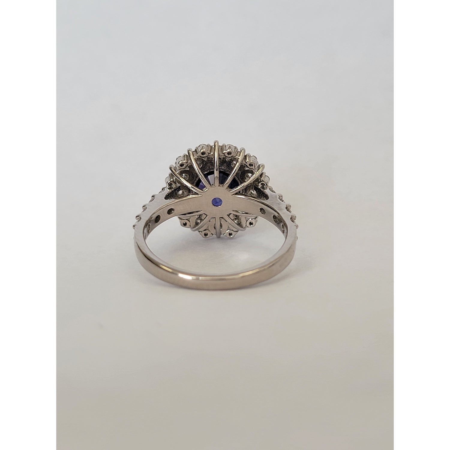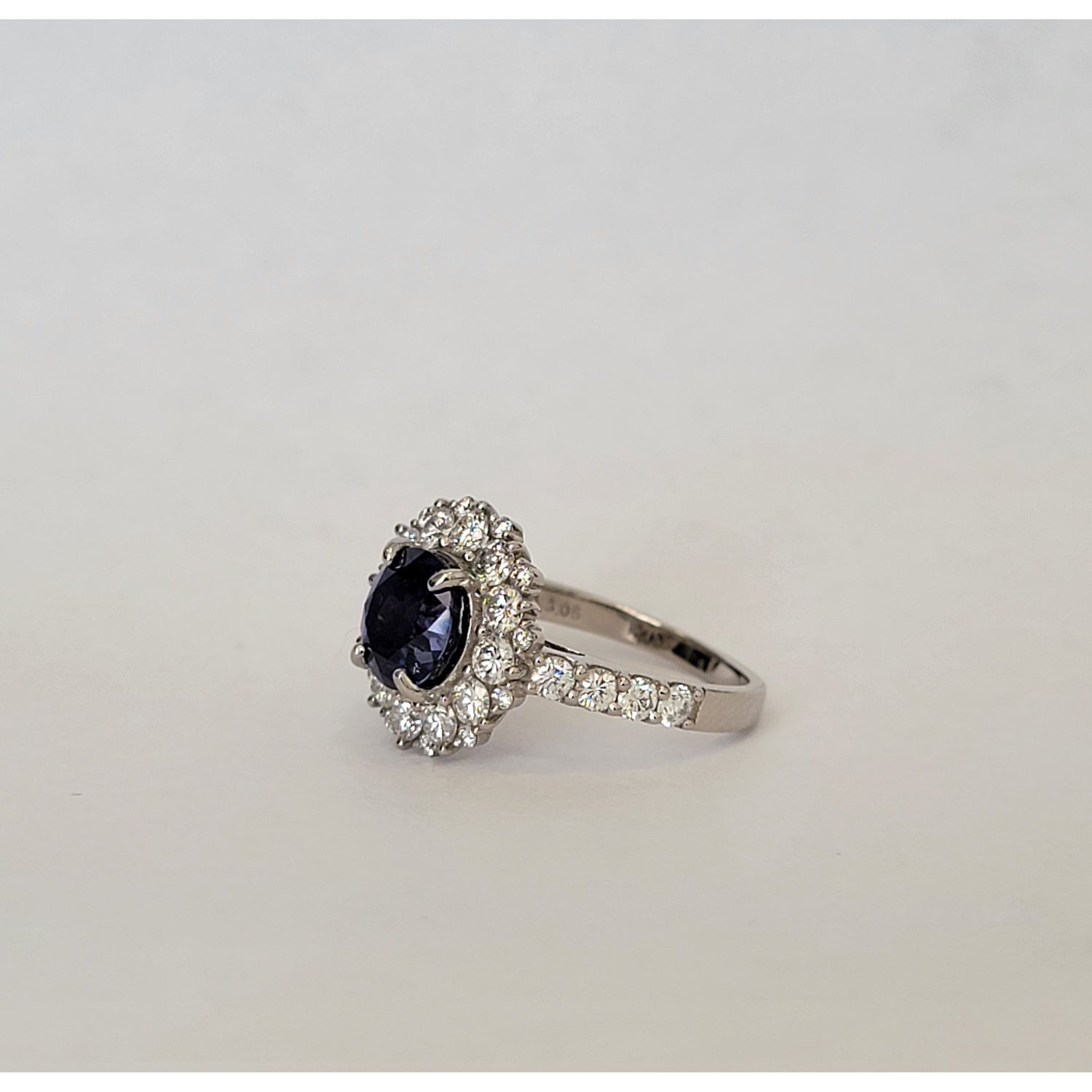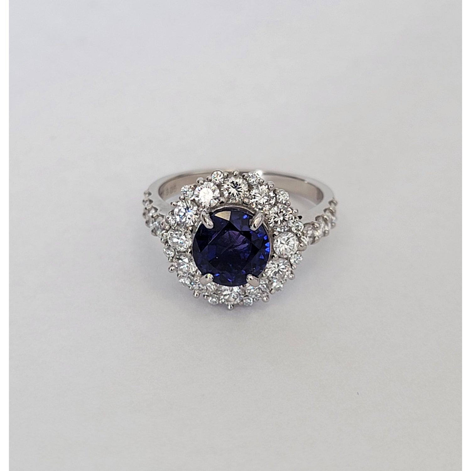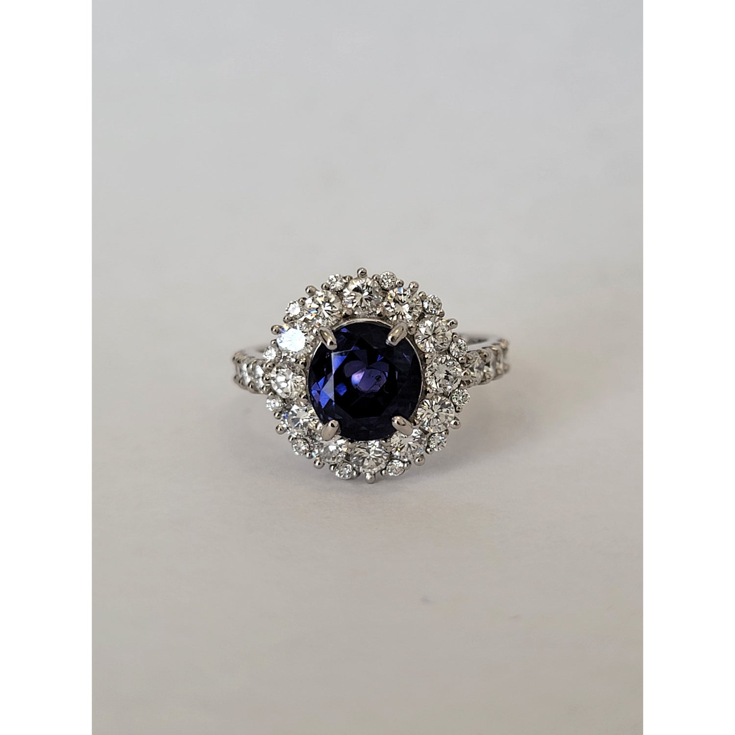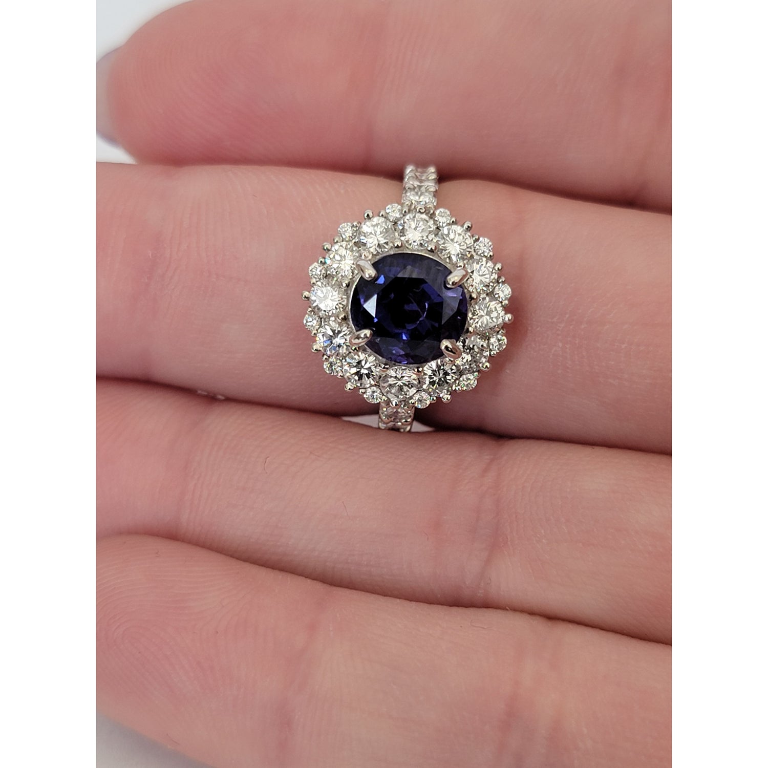 Exquisite 3.05ctw natural unheated Ceylon sapphire ring featuring a stunning blue-violet to purple color change, certified by GIA. The vibrant center stone is surrounded by 1.24ctw of VS clarity diamonds in a luxurious platinum halo setting. Ring size 6.5 with free sizing and shipping included.