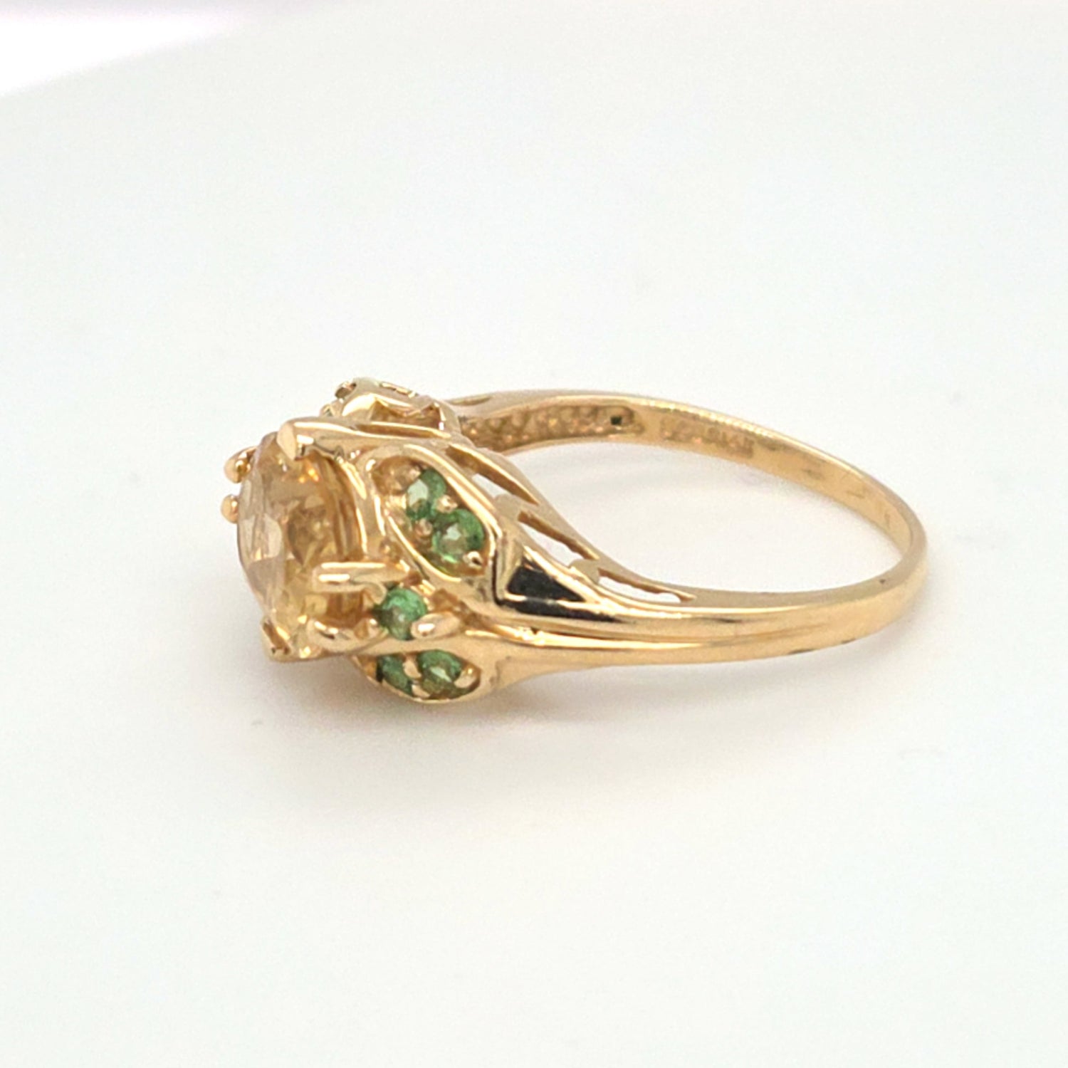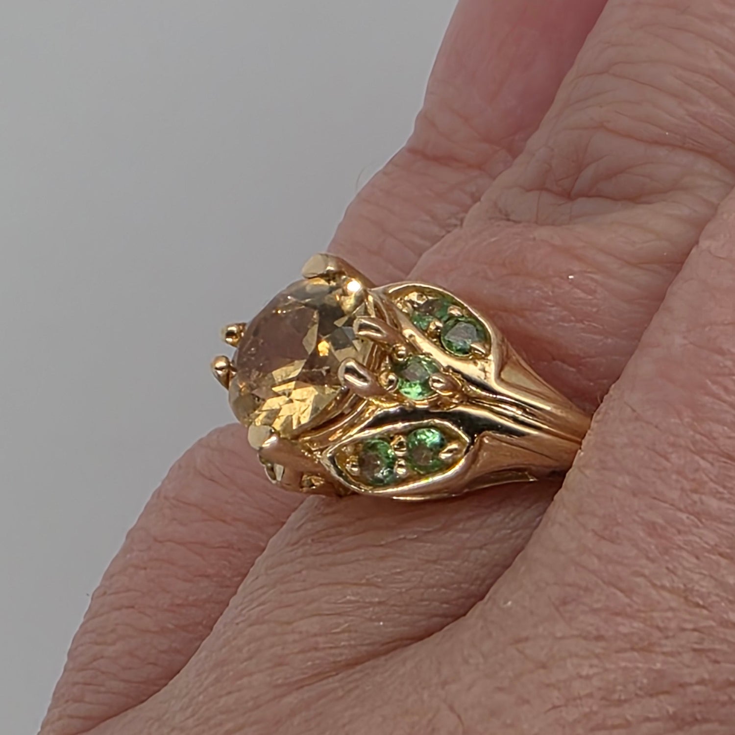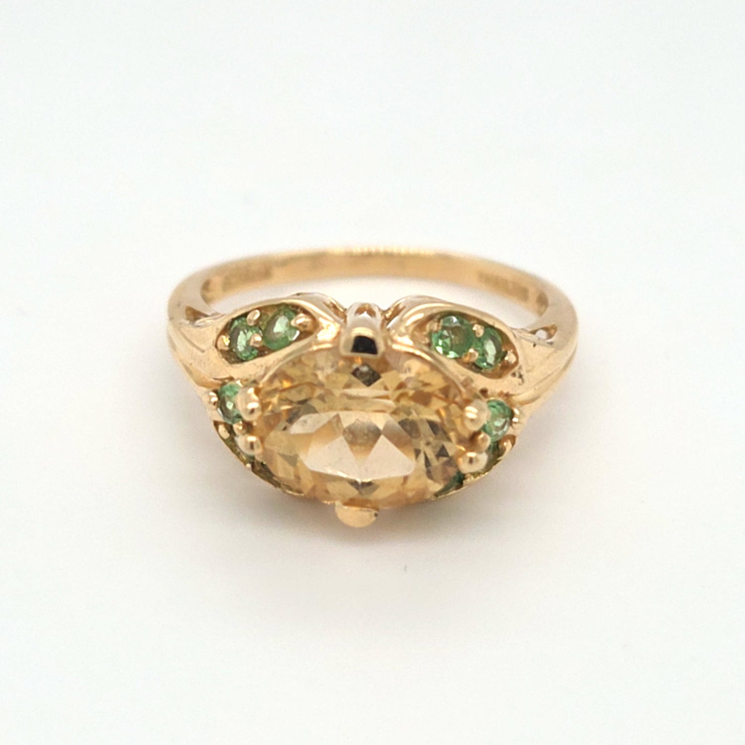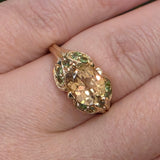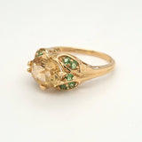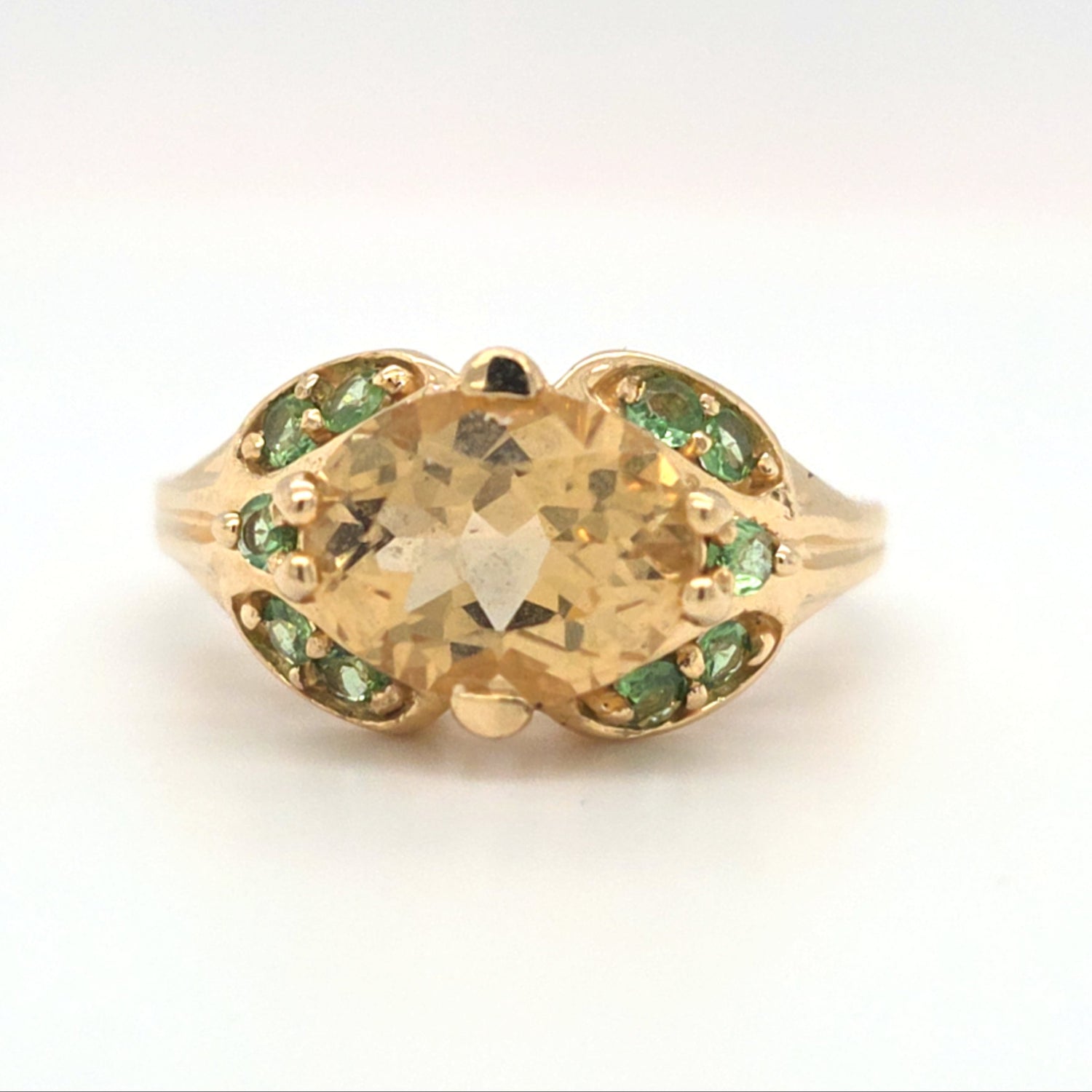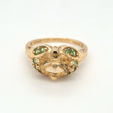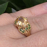 Stunning 3.00ctw Golden Beryl and green garnet ring set in warm 14kt gold, weighing 4 grams total. The glowing beryl center is beautifully accented by vibrant green garnets for a unique, eye-catching contrast. Size 8 and resizing available, making it perfect for everyday luxury or a standout gift.