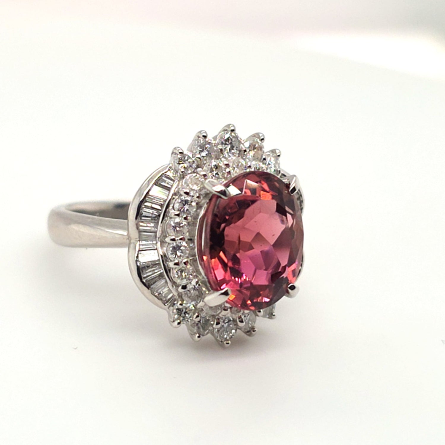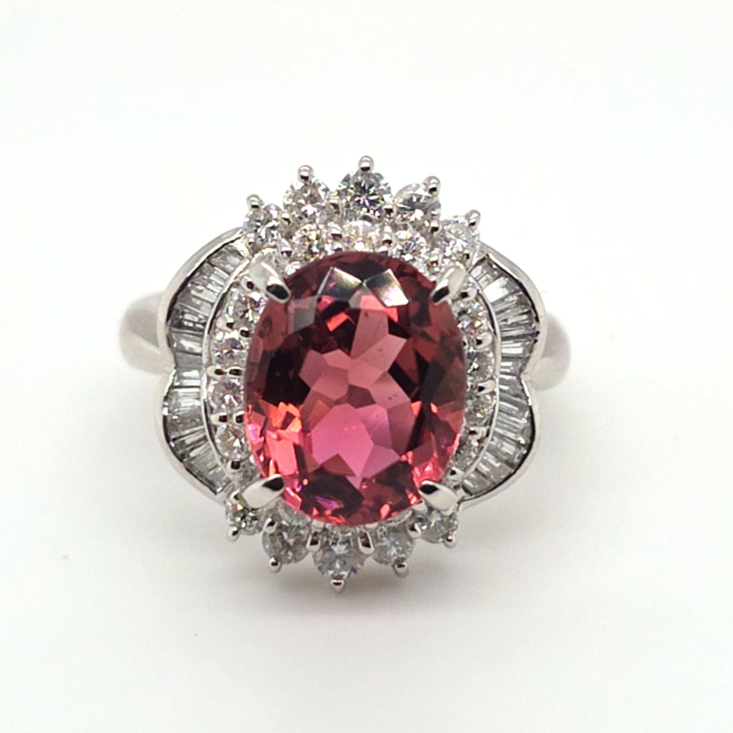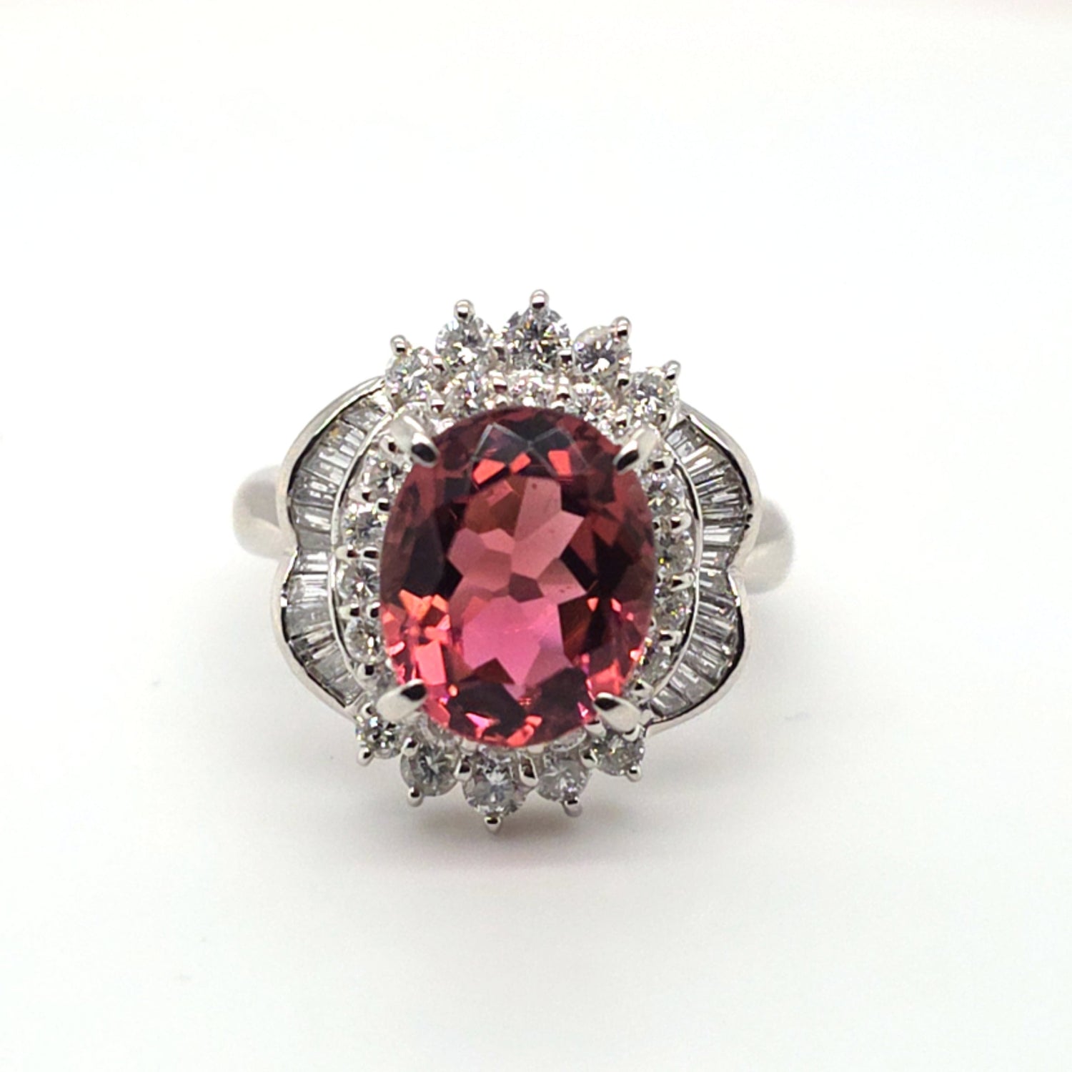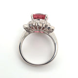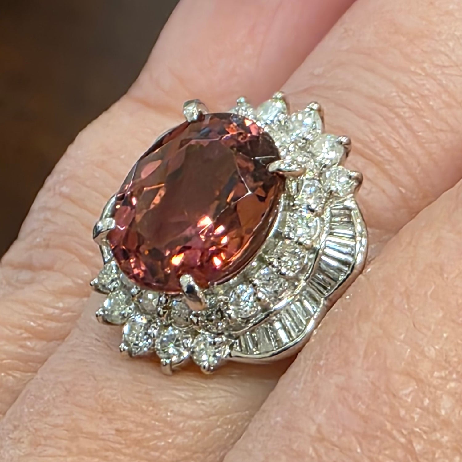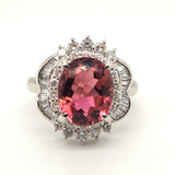 This stunning platinum ring showcases a vivid 4.89ct natural pinkish-peach tourmaline with exceptional brilliance and warmth. Surrounded by an ornate halo of 1.22ctw VS natural diamonds, the design delivers dramatic sparkle and vintage-inspired elegance. Ring size 7.5, perfect for collectors and lovers of bold, feminine gemstones.