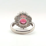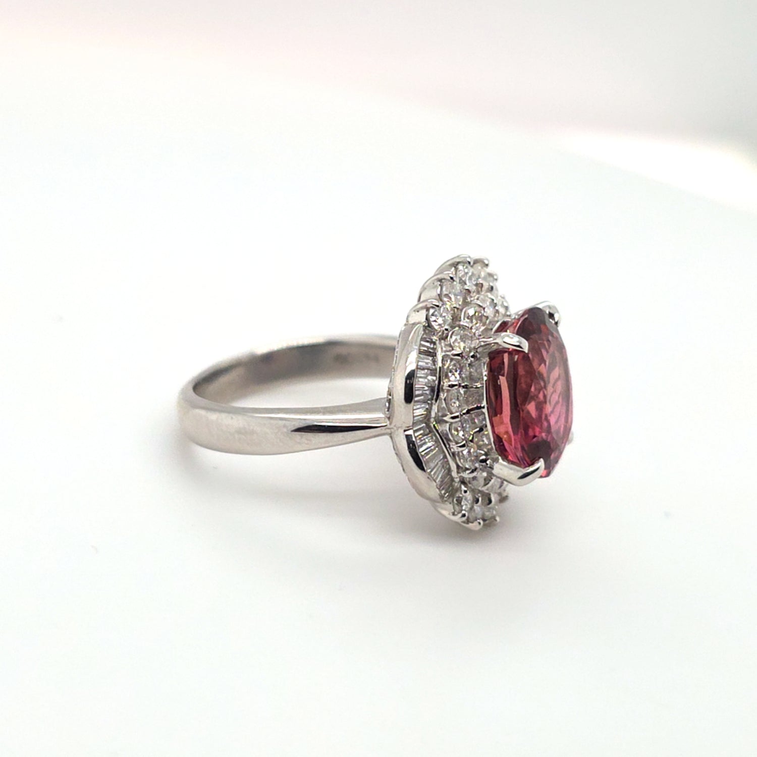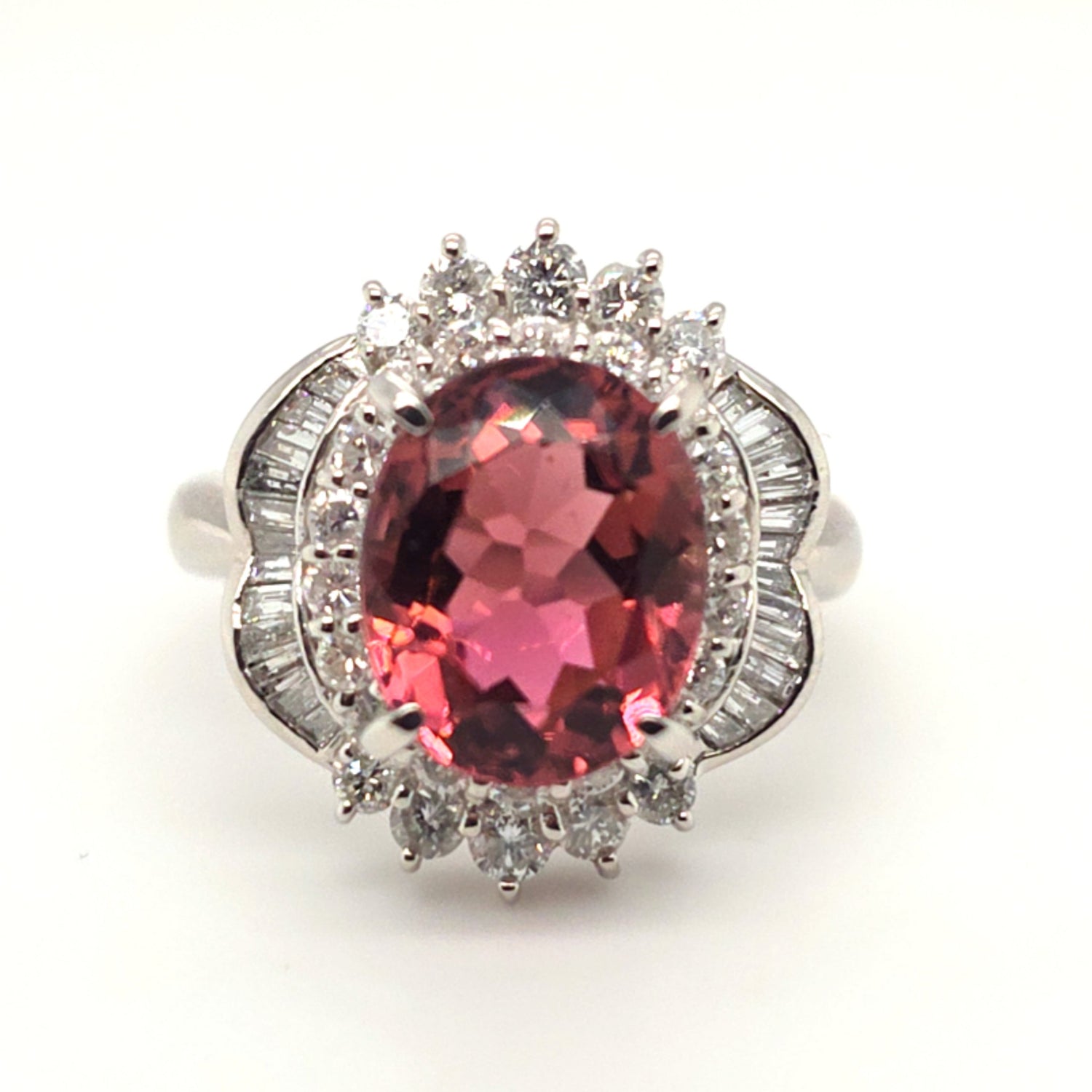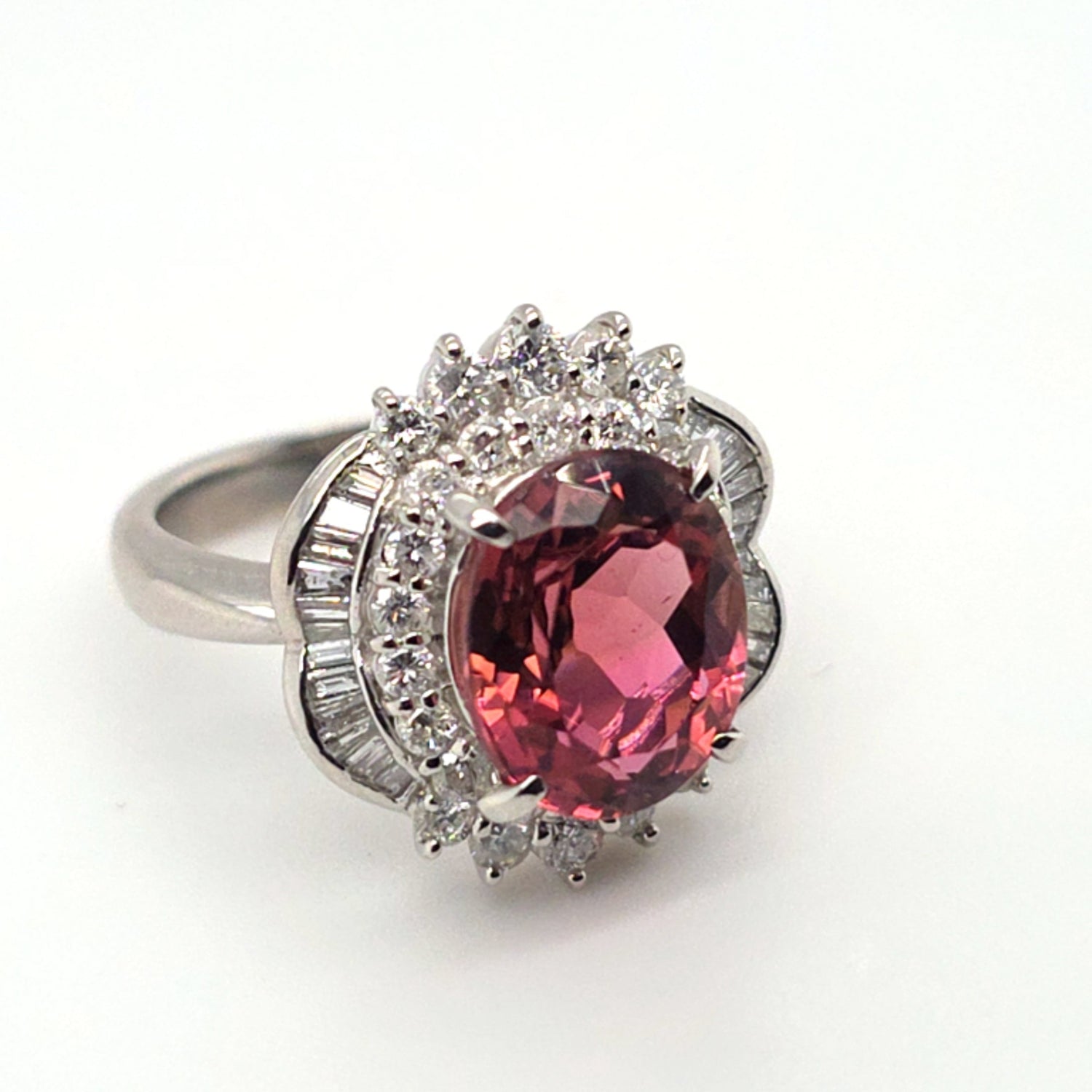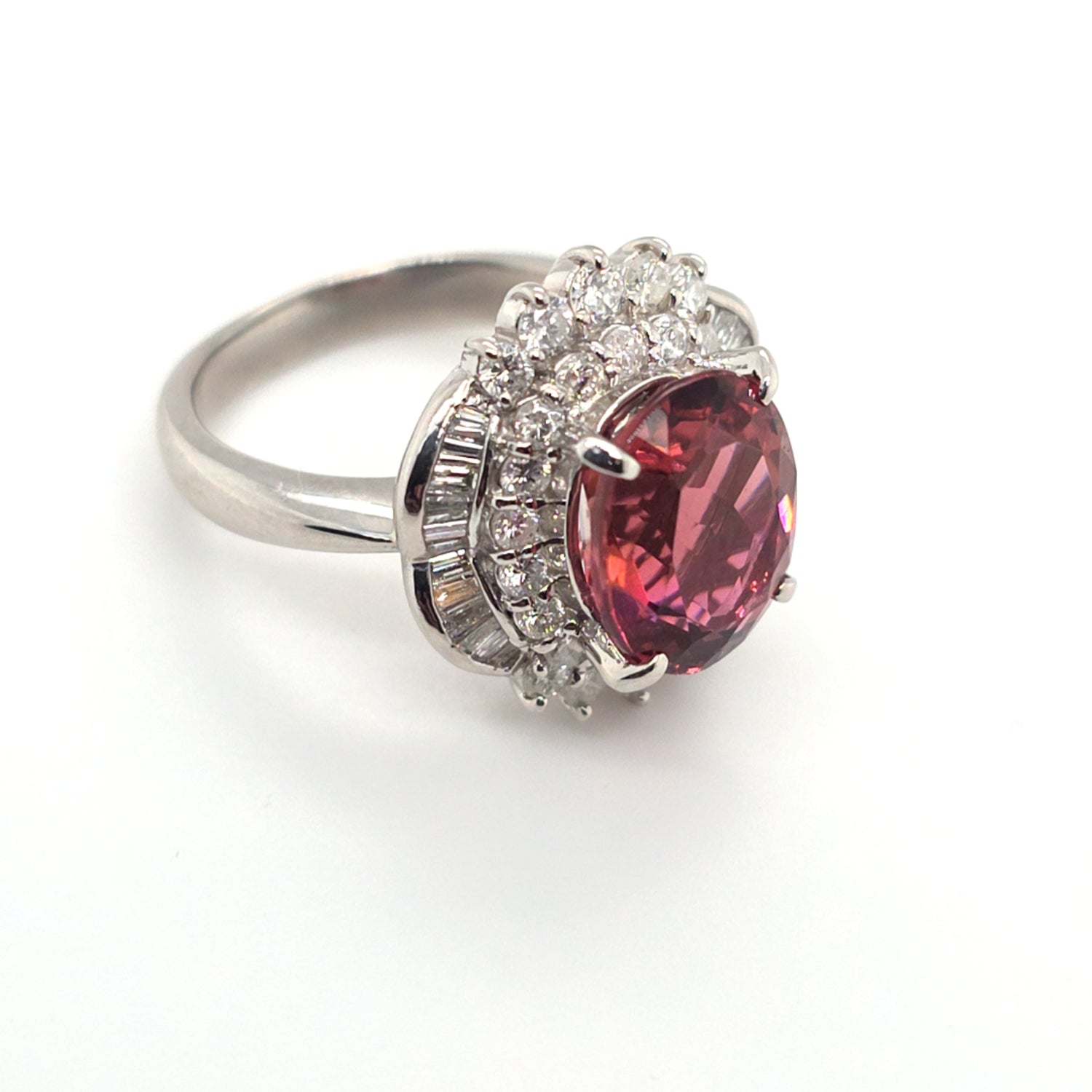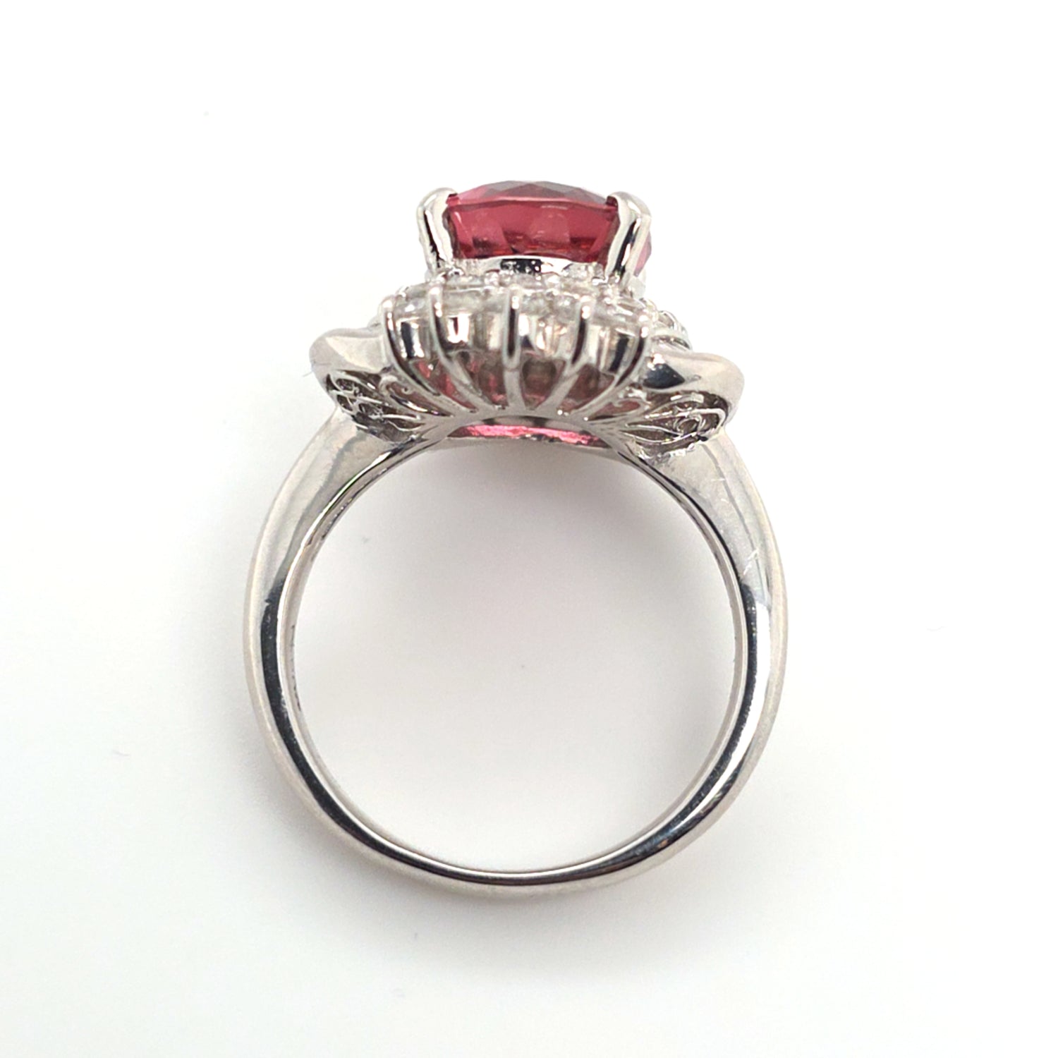This stunning platinum ring showcases a vivid 4.89ct natural pinkish-peach tourmaline with exceptional brilliance and warmth. Surrounded by an ornate halo of 1.22ctw VS natural diamonds, the design delivers dramatic sparkle and vintage-inspired elegance. Ring size 7.5, perfect for collectors and lovers of bold, feminine gemstones.
