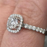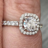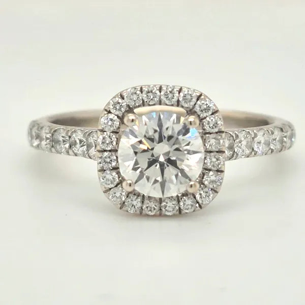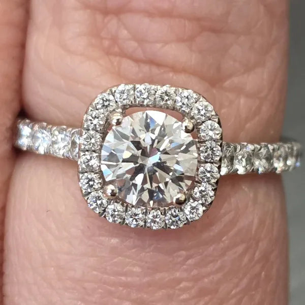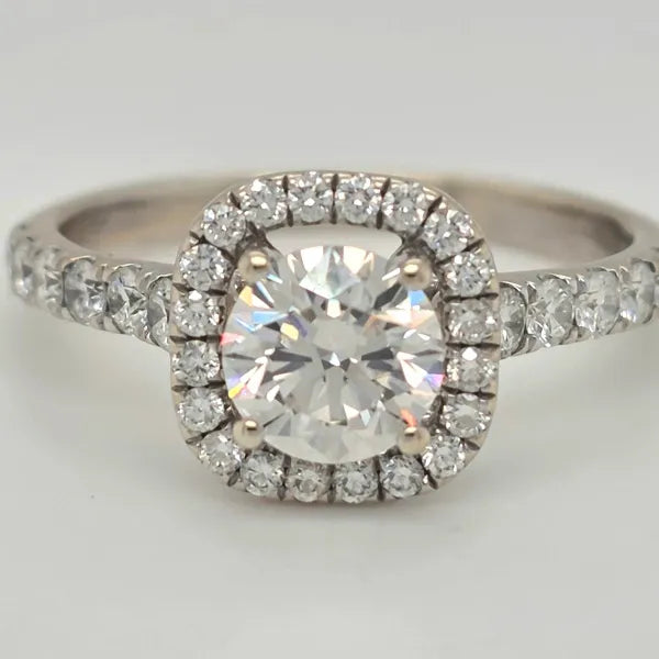 This dazzling 14KT white gold ring showcases a .90ct lab-grown diamond center surrounded by .50ctw of lab diamond accents, offering brilliant sparkle and modern sophistication. A stunning choice for engagements or special occasions. This ring can be sized just let us know and we can quote a price on sizing.