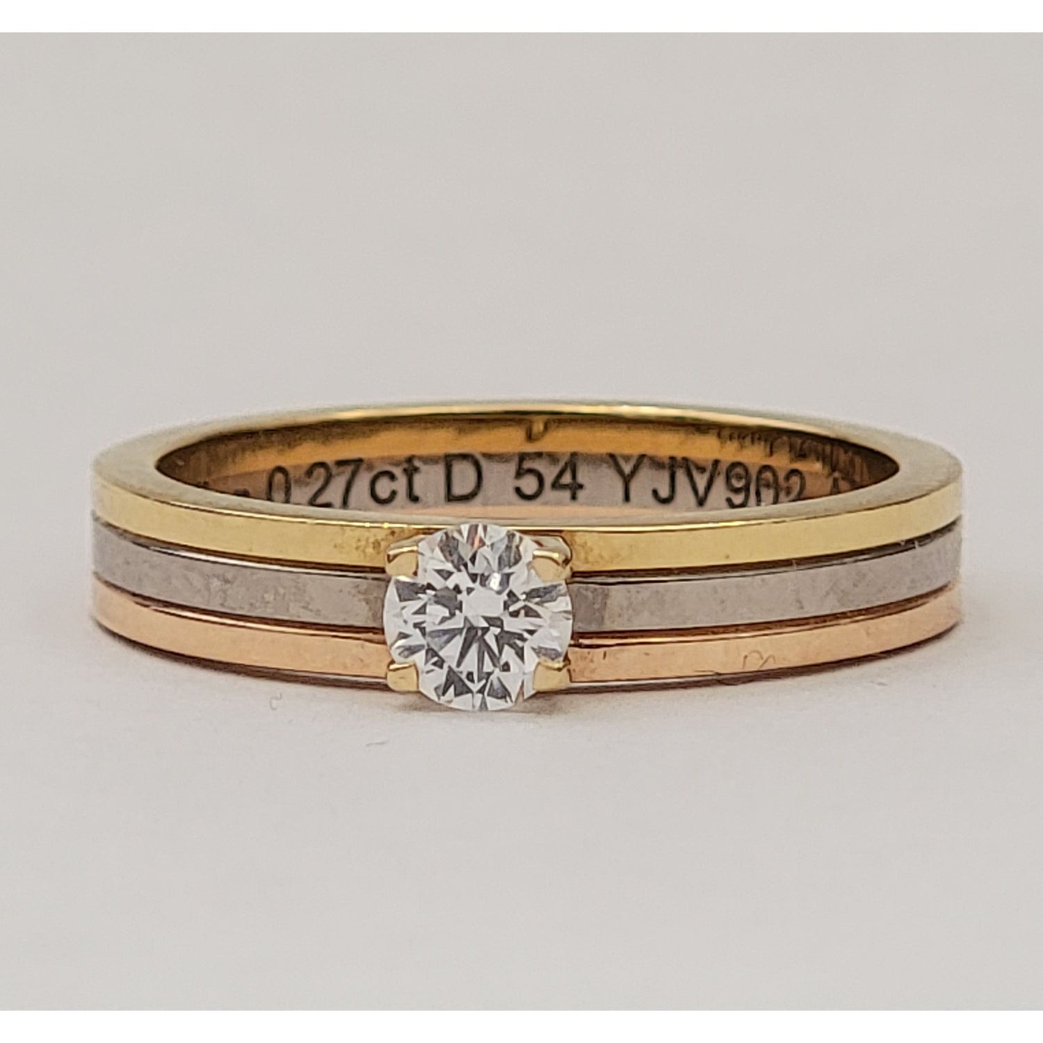 Authentic Cartier triple-tone 18kt gold diamond ring featuring a brilliant .27ctw round diamond, GIA graded D color and VS1 clarity. Elegant yellow, white, and rose gold bands highlight Cartier’s iconic craftsmanship. Includes original GIA report, Cartier paperwork, serial number, and original receipt.
