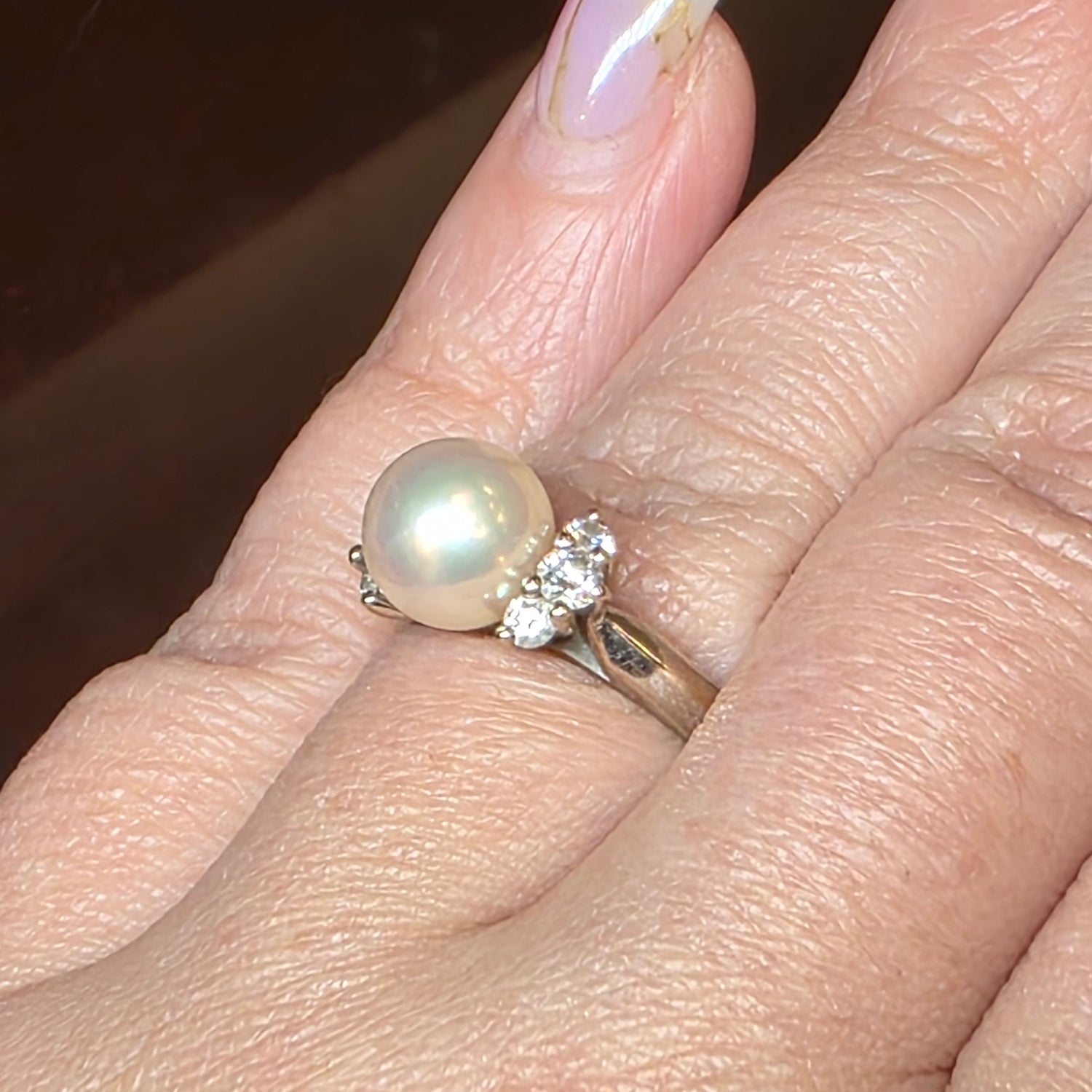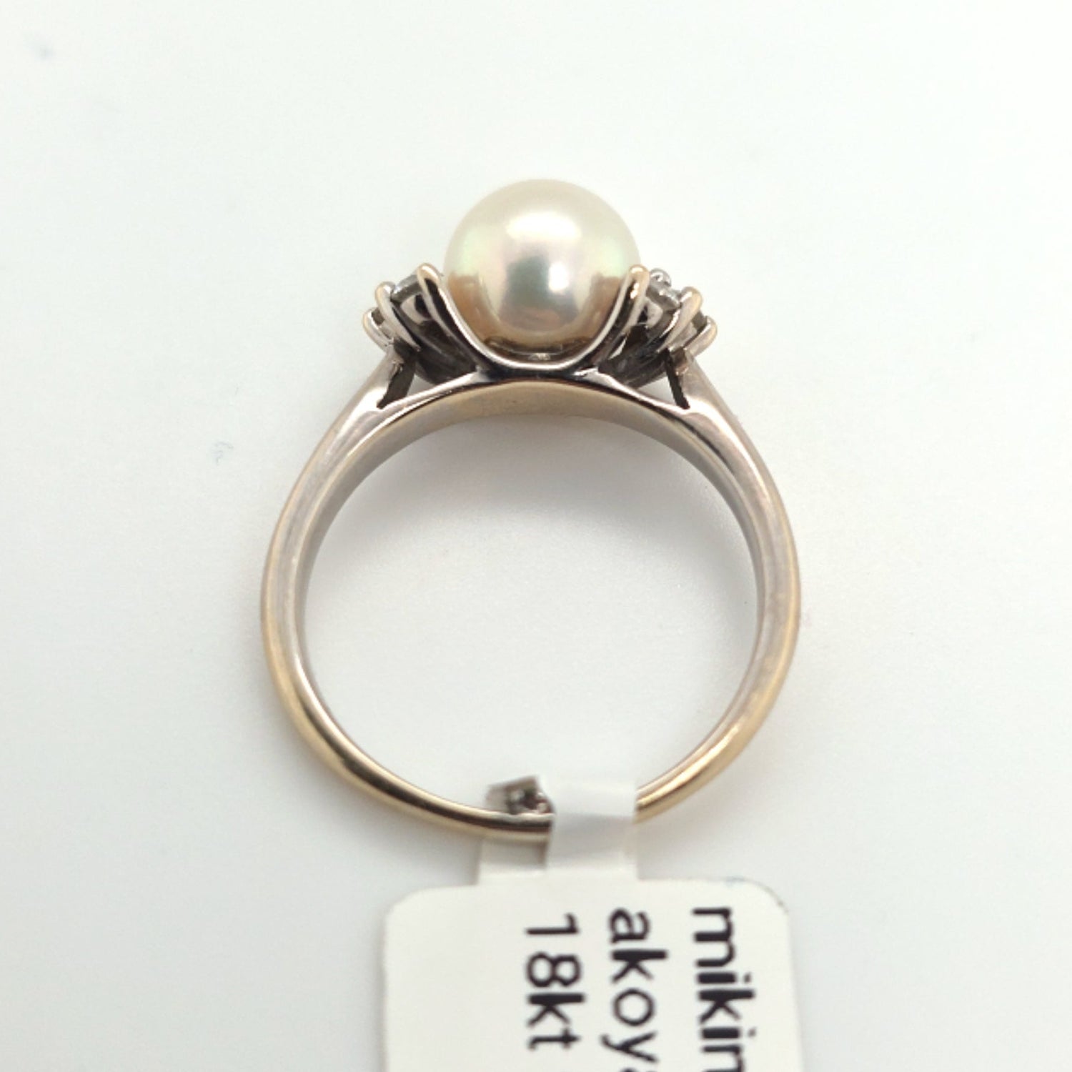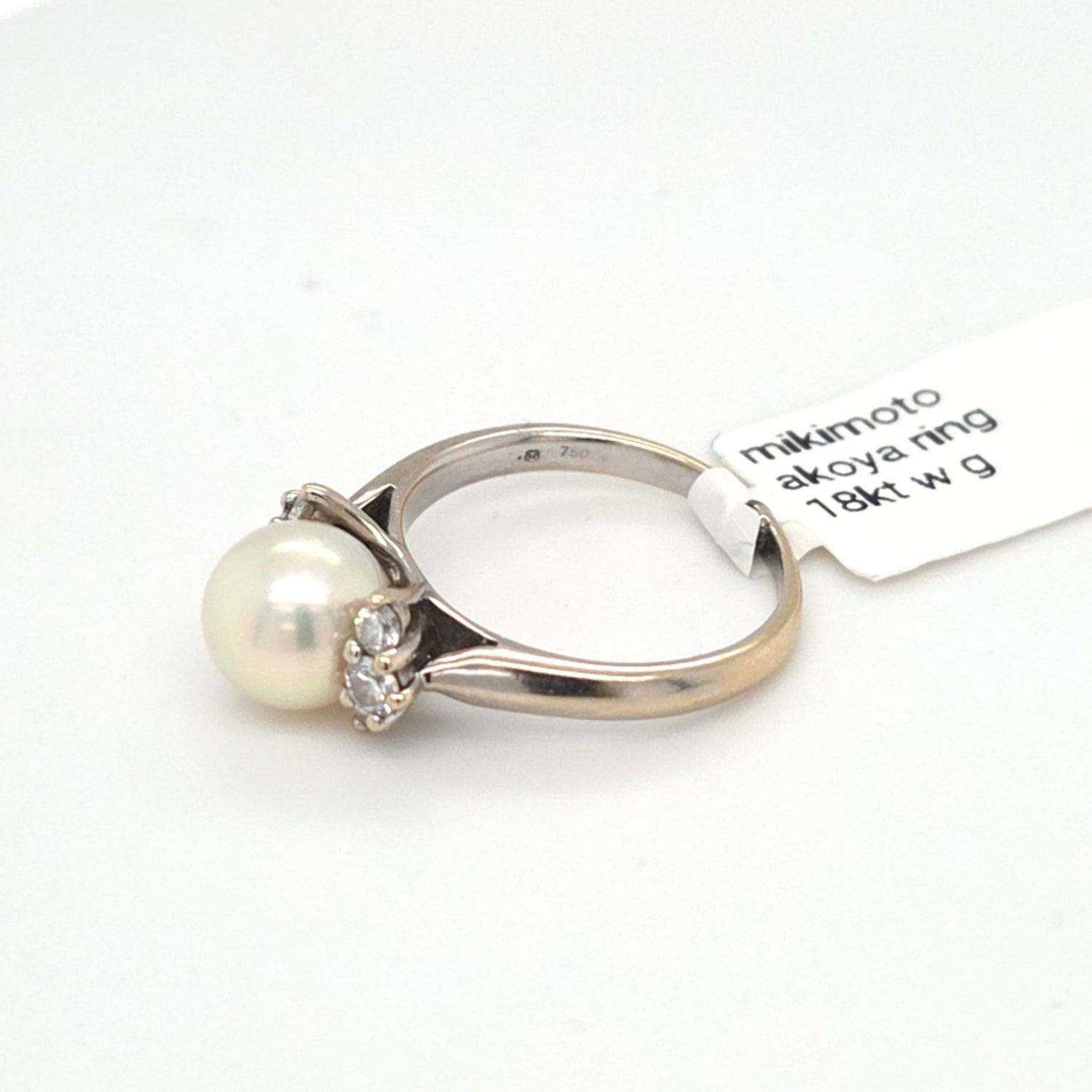 Elegant Mikimoto Akoya pearl ring accented with sparkling diamonds, set in luxurious 18kt white gold size 7.75. A timeless and sophisticated piece that exudes classic elegance and refined beauty.