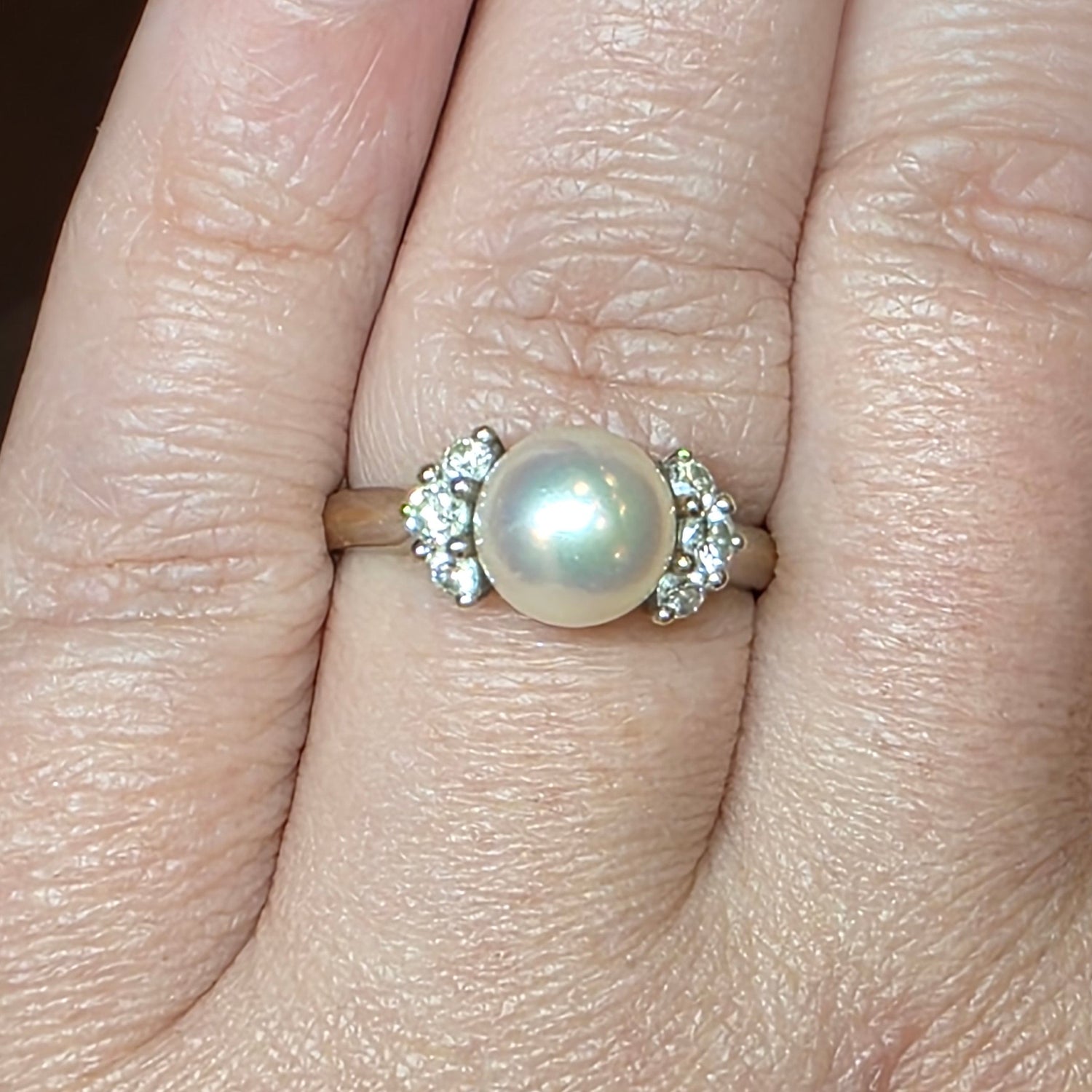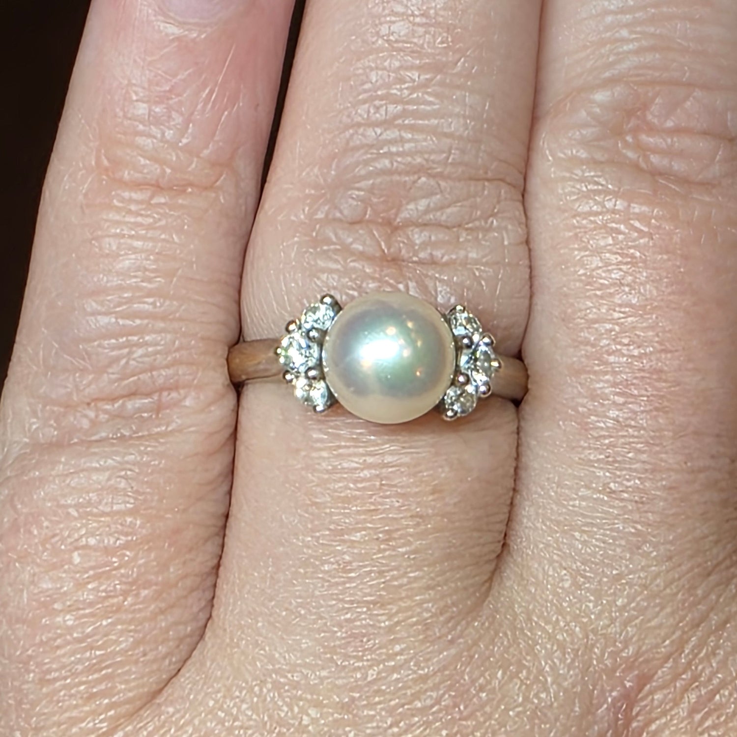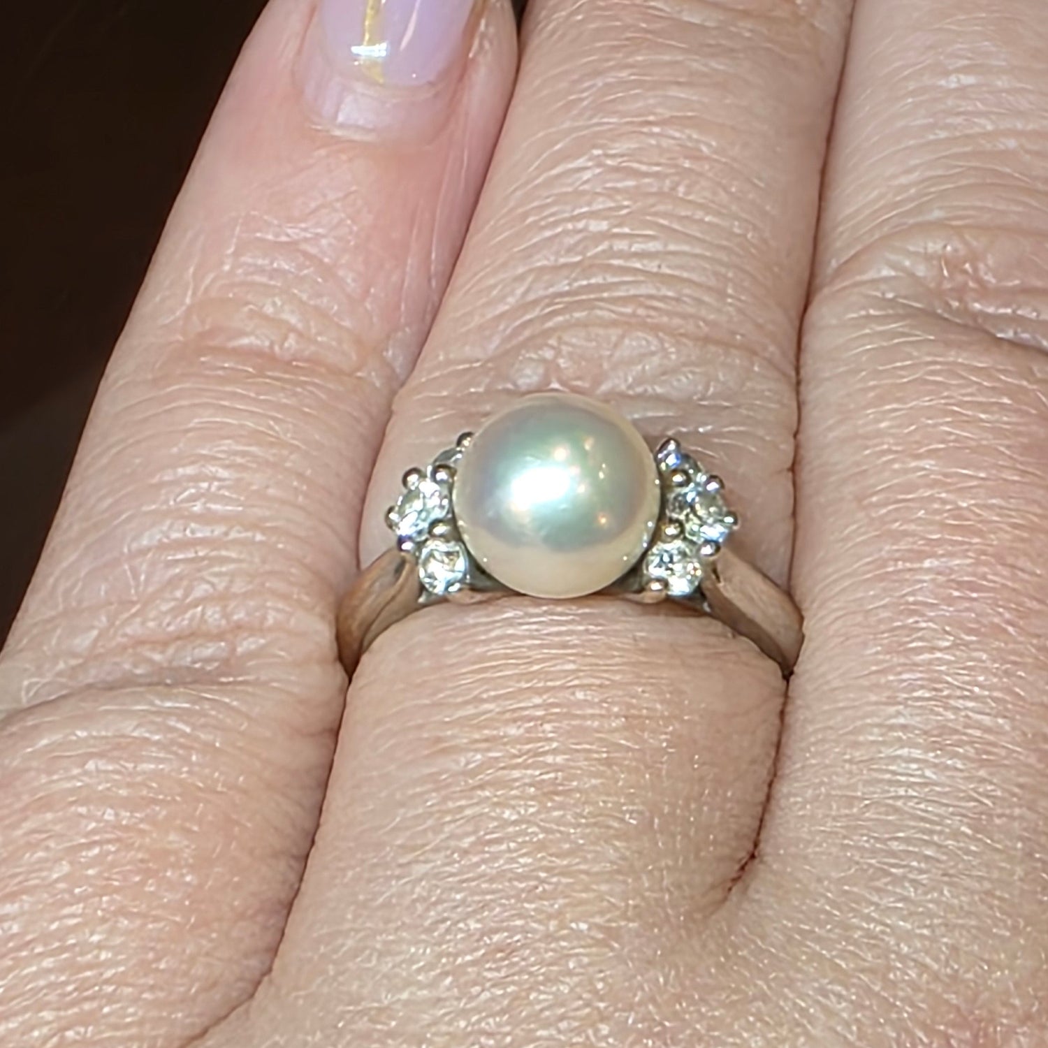 Elegant Mikimoto Akoya pearl ring accented with sparkling diamonds, set in luxurious 18kt white gold size 7.75. A timeless and sophisticated piece that exudes classic elegance and refined beauty.