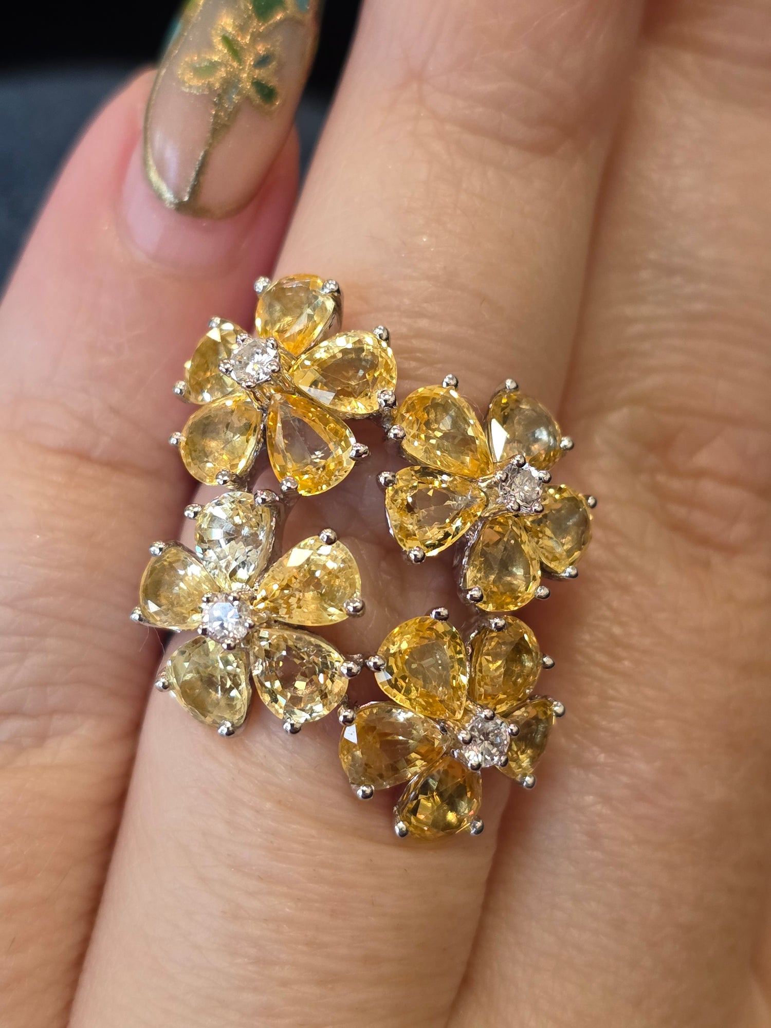 Make a radiant statement with this breathtaking 11.22ctw yellow sapphire ring, beautifully arranged in a stunning flower design. Accented by .24ctw of sparkling diamonds and set in luxurious 18kt white gold, it captures light and attention from every angle. A bold, one-of-a-kind piece that blends vibrant color with elegant brilliance.