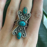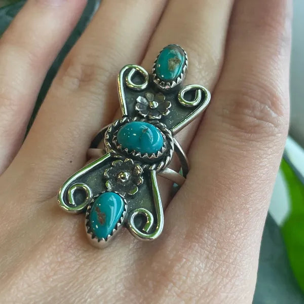 Beautiful Turquoise set in Sterling Silver with flower detailing. 8.8g total weight. This ring is a size 7 1/4 but can be resized if needed, just drop us a note at checkout for a quote!