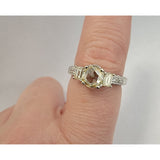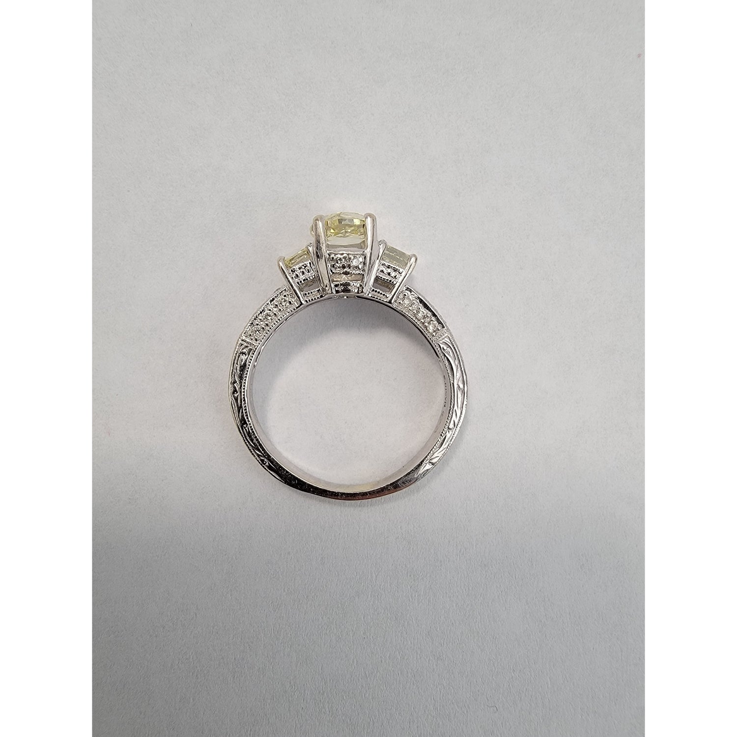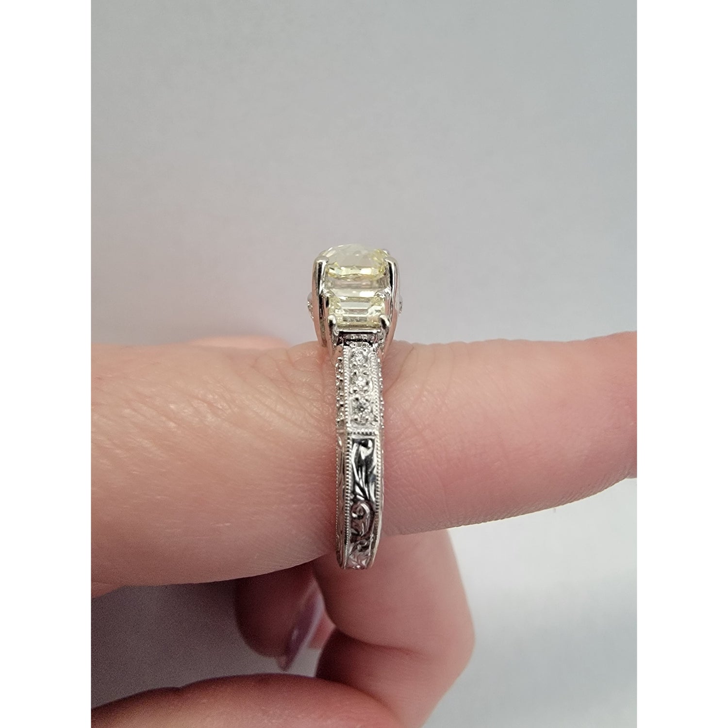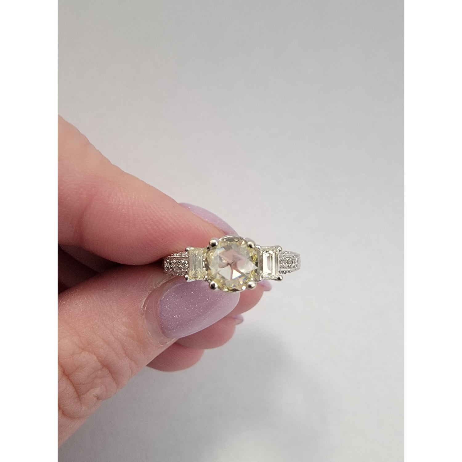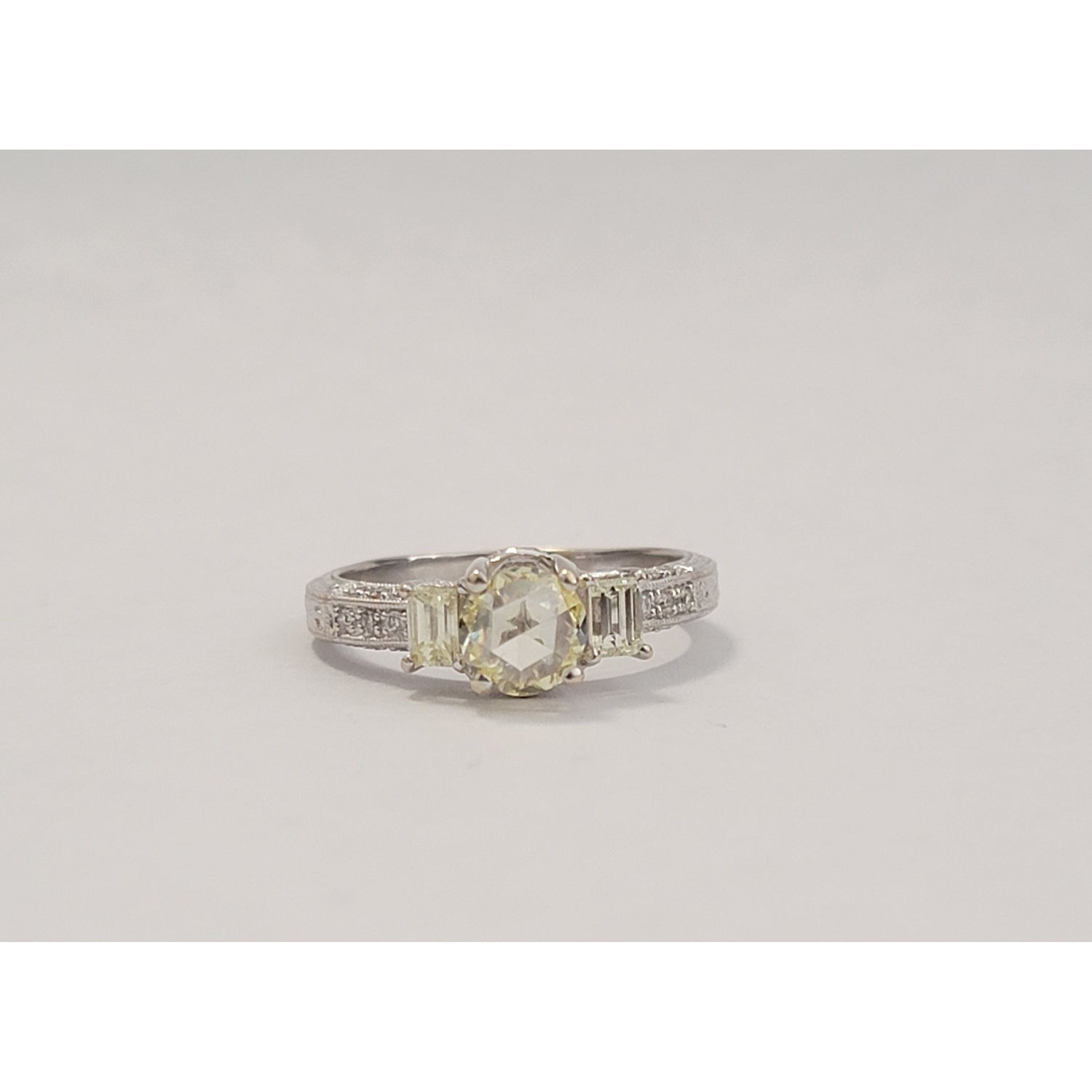 Elegant and timeless, this ring features a soft yellow rose-cut diamond set in glowing 14kt white gold. The center stone is beautifully accented by baguette and pavé diamonds along the band, adding refined sparkle from every angle. A perfect blend of vintage romance and modern sophistication, sized at 7.5.